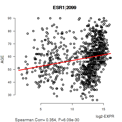Figure S1. Get High-res Image As an example, this figure shows the association of ESR1|2099 to 'AGE'. P value = 6.09e-30 with Spearman correlation analysis. The straight line presents the best linear regression.