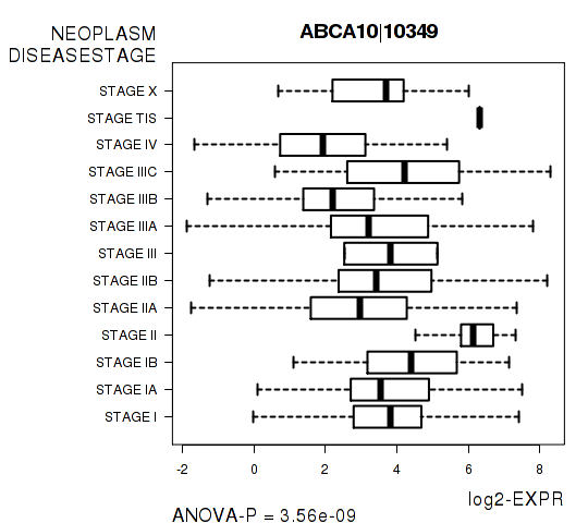 Figure S2. Get High-res Image As an example, this figure shows the association of ABCA10|10349 to 'NEOPLASM.DISEASESTAGE'. P value = 3.56e-09 with ANOVA analysis.