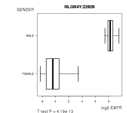 Figure S6. Get High-res Image As an example, this figure shows the association of NLGN4Y|22829 to 'GENDER'. P value = 4.19e-13 with T-test analysis.