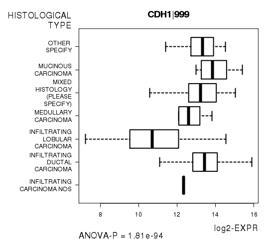 Figure S7. Get High-res Image As an example, this figure shows the association of CDH1|999 to 'HISTOLOGICAL.TYPE'. P value = 1.81e-94 with ANOVA analysis.