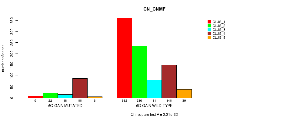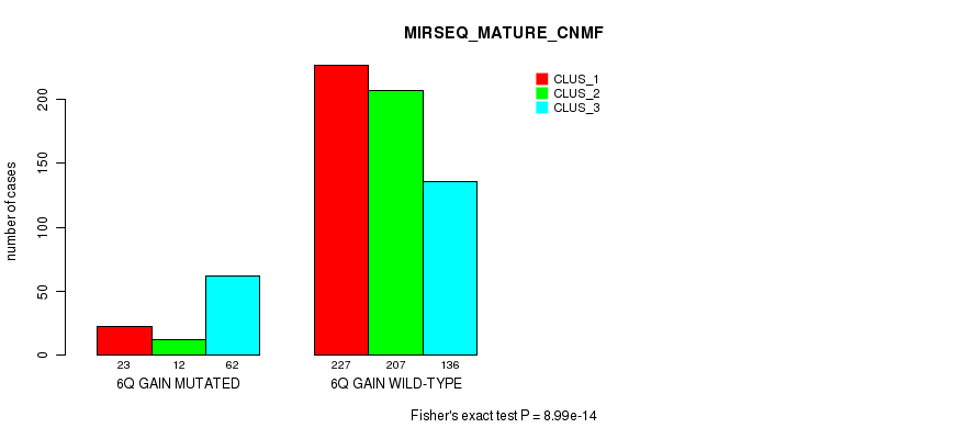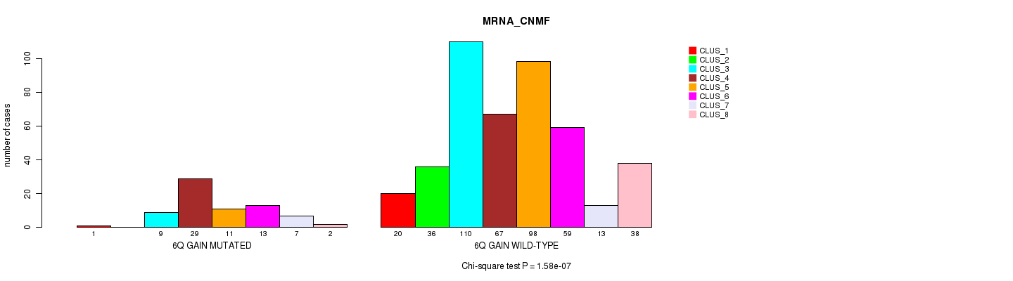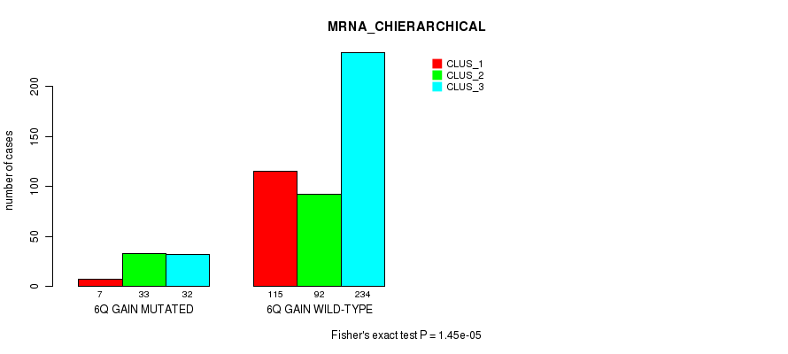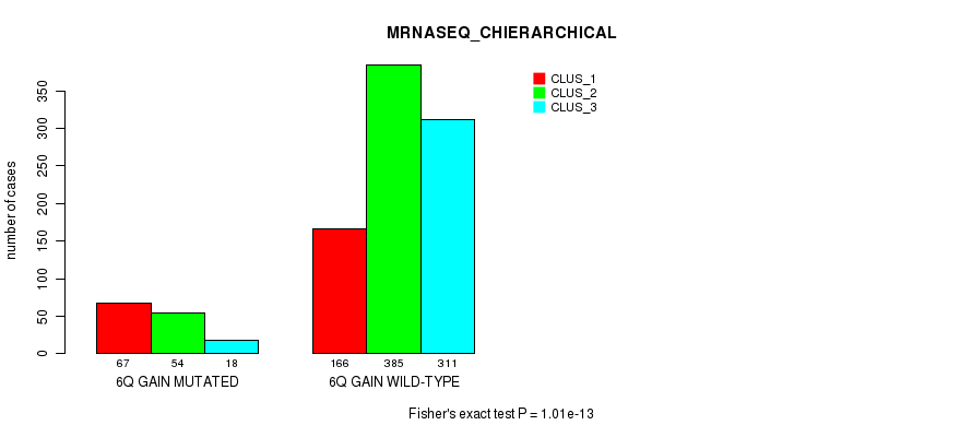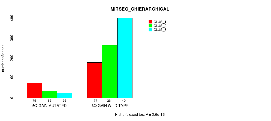 6q gain cnv correlated to 'MRNA_CNMF', 'MRNA_CHIERARCHICAL', 'CN_CNMF', 'METHLYATION_CNMF', 'RPPA_CNMF', 'MRNASEQ_CNMF', 'MRNASEQ_CHIERARCHICAL', 'MIRSEQ_CNMF', 'MIRSEQ_CHIERARCHICAL', 'MIRSEQ_MATURE_CNMF', and 'MIRSEQ_MATURE_CHIERARCHICAL'.