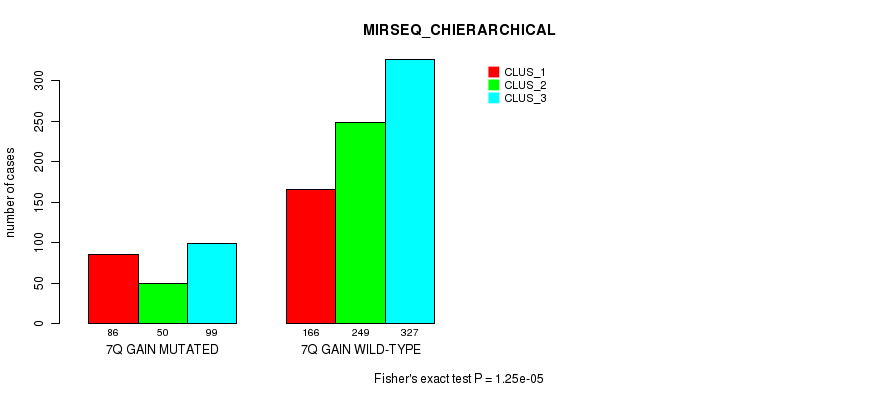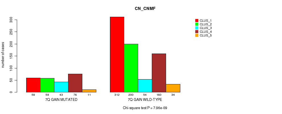 7q gain cnv correlated to 'CN_CNMF', 'METHLYATION_CNMF', 'MRNASEQ_CNMF', 'MRNASEQ_CHIERARCHICAL', and 'MIRSEQ_CHIERARCHICAL'.