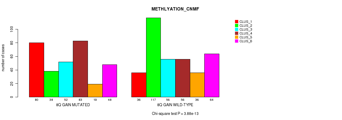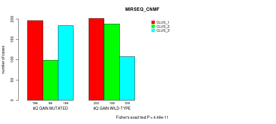 8q gain cnv correlated to 'MRNA_CNMF', 'CN_CNMF', 'METHLYATION_CNMF', 'MRNASEQ_CNMF', 'MRNASEQ_CHIERARCHICAL', 'MIRSEQ_CNMF', 'MIRSEQ_CHIERARCHICAL', 'MIRSEQ_MATURE_CNMF', and 'MIRSEQ_MATURE_CHIERARCHICAL'.
