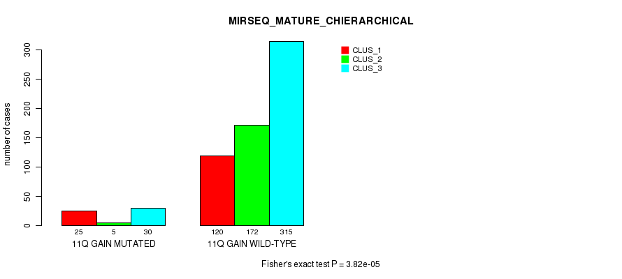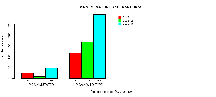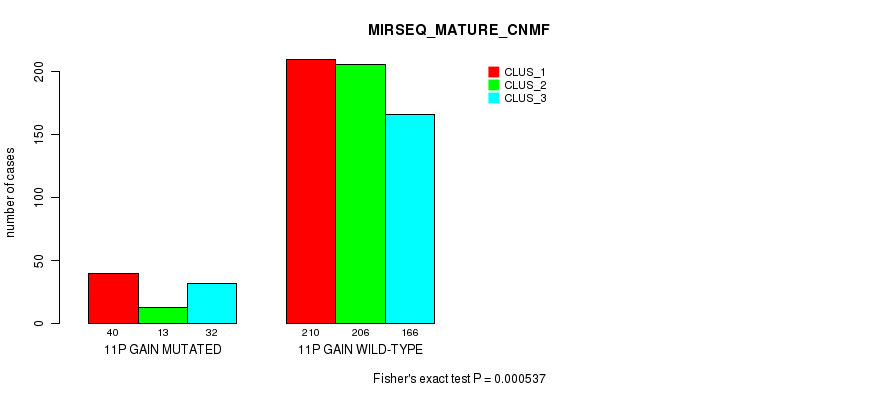 11p gain cnv correlated to 'CN_CNMF', 'MIRSEQ_MATURE_CNMF', and 'MIRSEQ_MATURE_CHIERARCHICAL'.