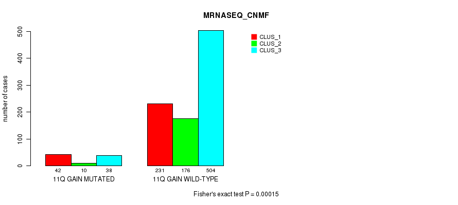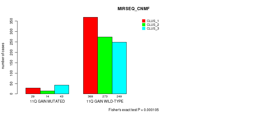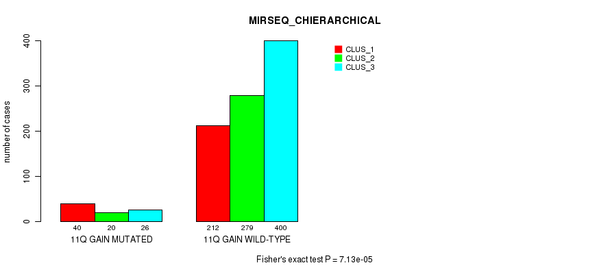 11q gain cnv correlated to 'CN_CNMF', 'MRNASEQ_CNMF', 'MRNASEQ_CHIERARCHICAL', 'MIRSEQ_CNMF', 'MIRSEQ_CHIERARCHICAL', 'MIRSEQ_MATURE_CNMF', and 'MIRSEQ_MATURE_CHIERARCHICAL'.