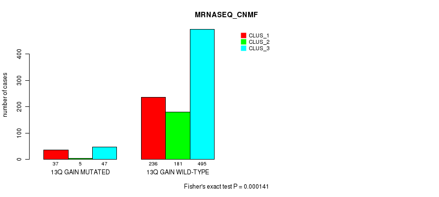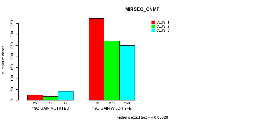 13q gain cnv correlated to 'CN_CNMF', 'MRNASEQ_CNMF', 'MRNASEQ_CHIERARCHICAL', 'MIRSEQ_CNMF', and 'MIRSEQ_CHIERARCHICAL'.