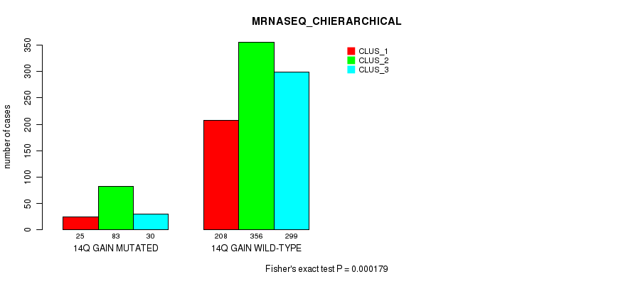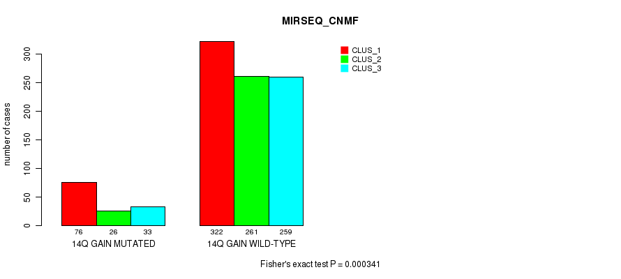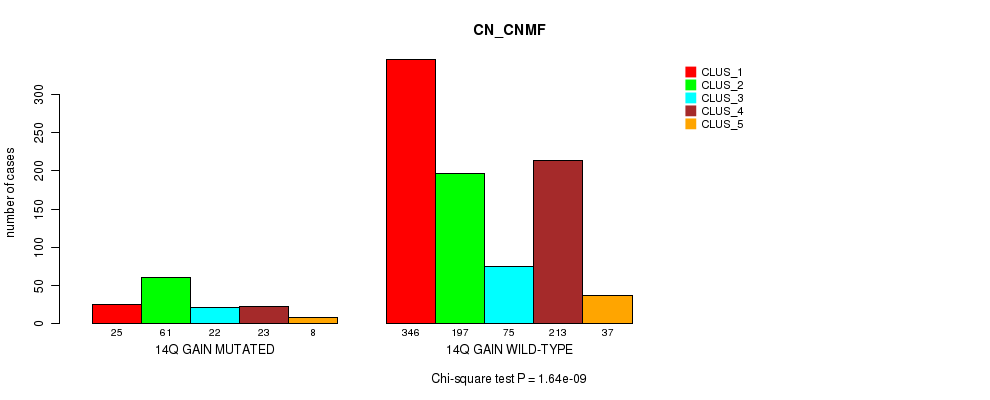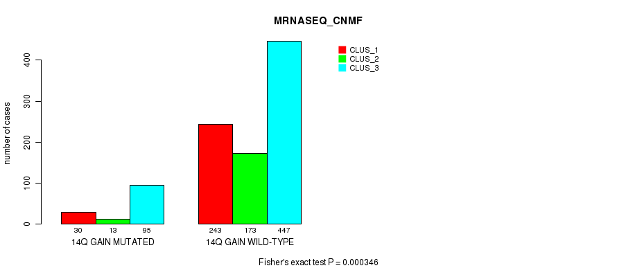 14q gain cnv correlated to 'CN_CNMF', 'MRNASEQ_CNMF', 'MRNASEQ_CHIERARCHICAL', and 'MIRSEQ_CNMF'.