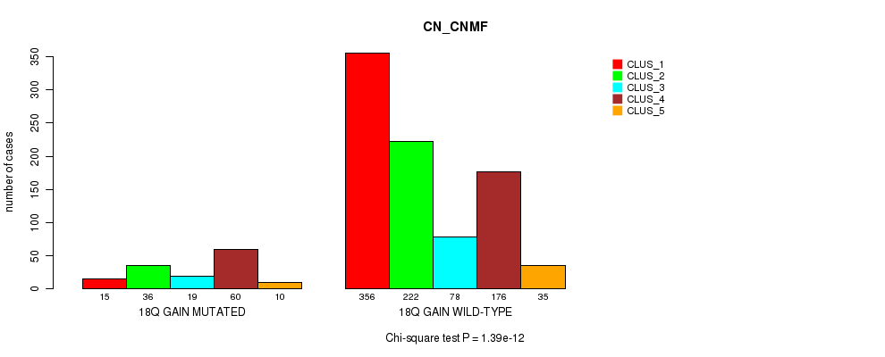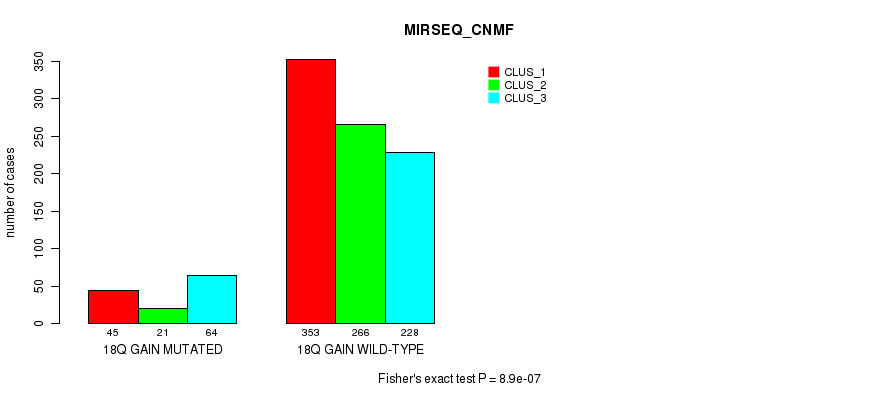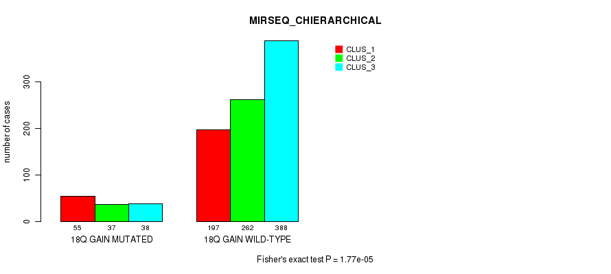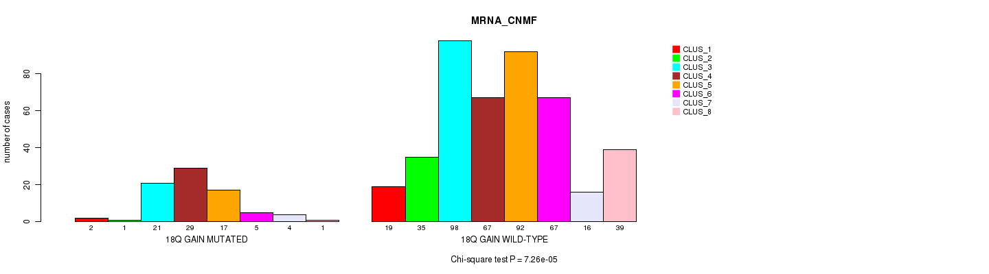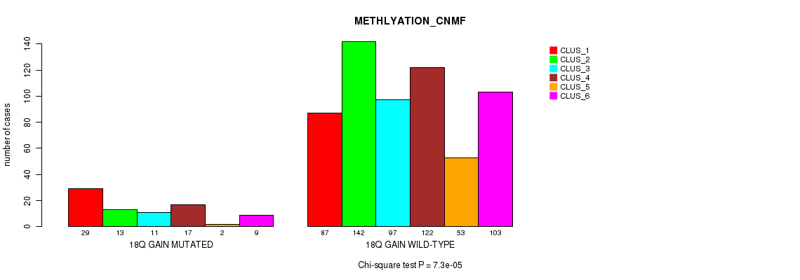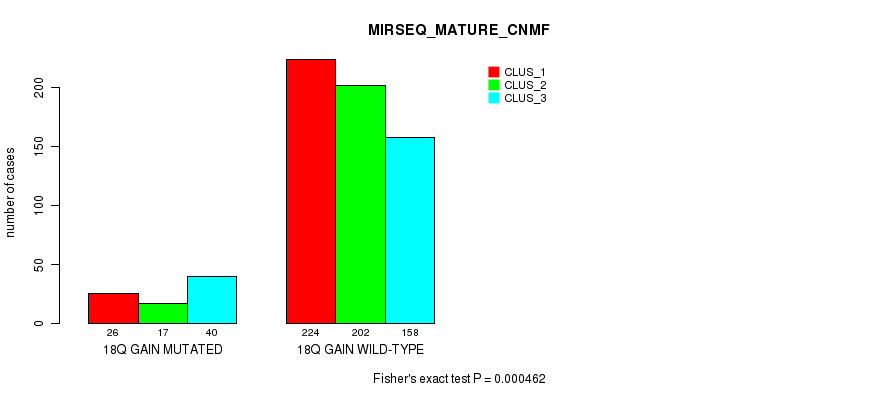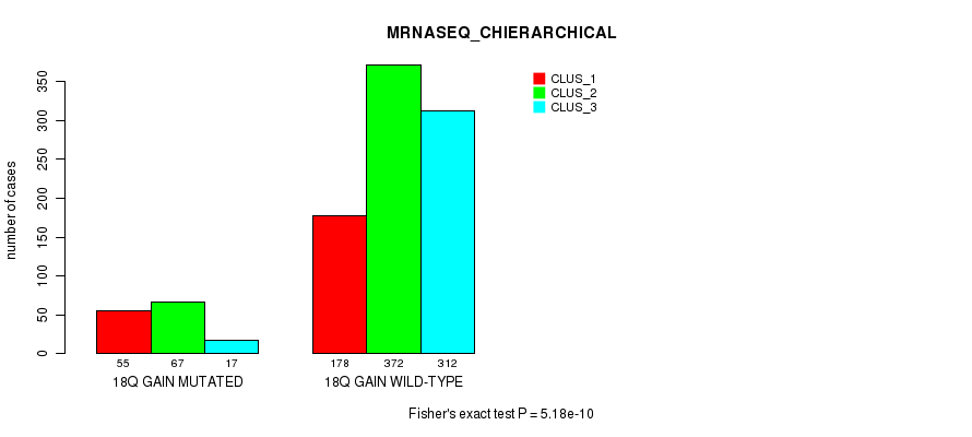 18q gain cnv correlated to 'MRNA_CNMF', 'MRNA_CHIERARCHICAL', 'CN_CNMF', 'METHLYATION_CNMF', 'MRNASEQ_CNMF', 'MRNASEQ_CHIERARCHICAL', 'MIRSEQ_CNMF', 'MIRSEQ_CHIERARCHICAL', 'MIRSEQ_MATURE_CNMF', and 'MIRSEQ_MATURE_CHIERARCHICAL'.
