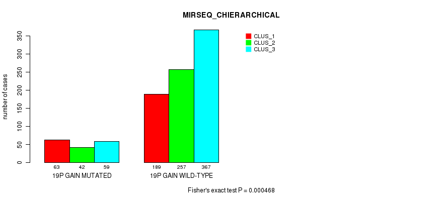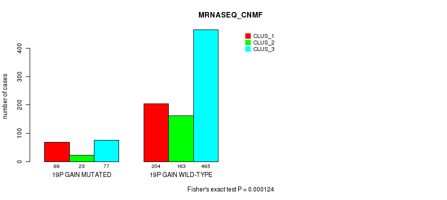 19p gain cnv correlated to 'CN_CNMF', 'MRNASEQ_CNMF', 'MRNASEQ_CHIERARCHICAL', 'MIRSEQ_CNMF', and 'MIRSEQ_CHIERARCHICAL'.