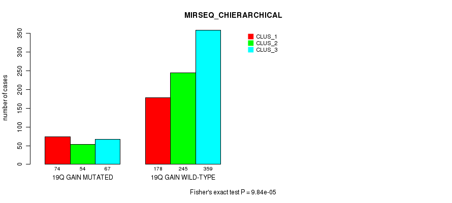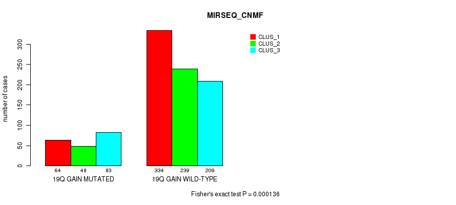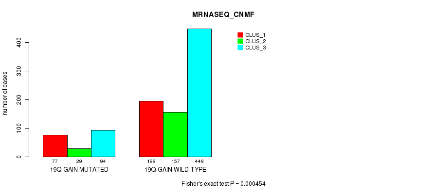 19q gain cnv correlated to 'CN_CNMF', 'MRNASEQ_CNMF', 'MRNASEQ_CHIERARCHICAL', 'MIRSEQ_CNMF', and 'MIRSEQ_CHIERARCHICAL'.