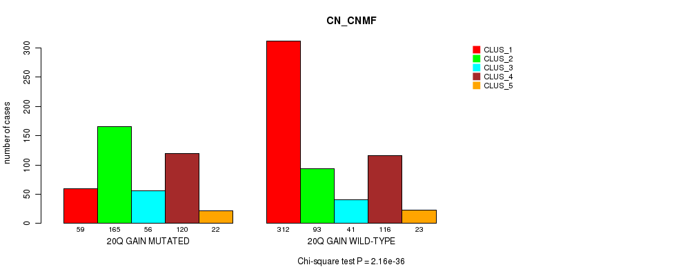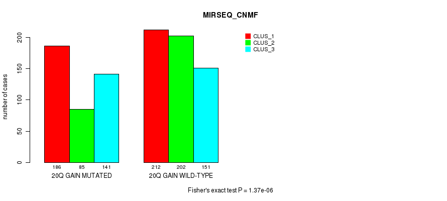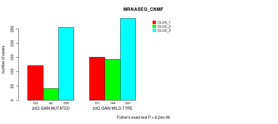 20q gain cnv correlated to 'MRNA_CNMF', 'CN_CNMF', 'METHLYATION_CNMF', 'MRNASEQ_CNMF', 'MRNASEQ_CHIERARCHICAL', 'MIRSEQ_CNMF', 'MIRSEQ_CHIERARCHICAL', 'MIRSEQ_MATURE_CNMF', and 'MIRSEQ_MATURE_CHIERARCHICAL'.