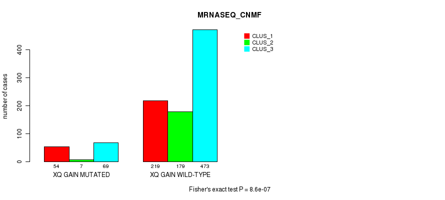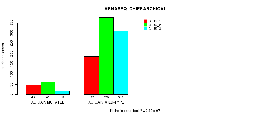 xq gain cnv correlated to 'MRNA_CHIERARCHICAL', 'CN_CNMF', 'MRNASEQ_CNMF', 'MRNASEQ_CHIERARCHICAL', 'MIRSEQ_CNMF', 'MIRSEQ_CHIERARCHICAL', and 'MIRSEQ_MATURE_CNMF'.