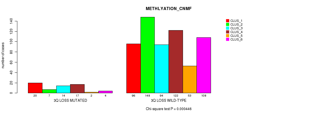 3q loss cnv correlated to 'CN_CNMF', 'METHLYATION_CNMF', 'MRNASEQ_CNMF', 'MRNASEQ_CHIERARCHICAL', and 'MIRSEQ_CNMF'.