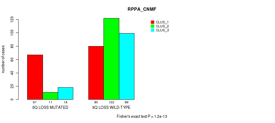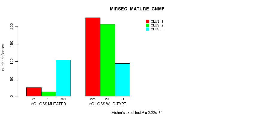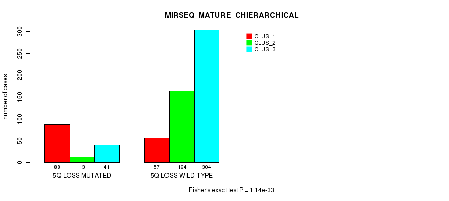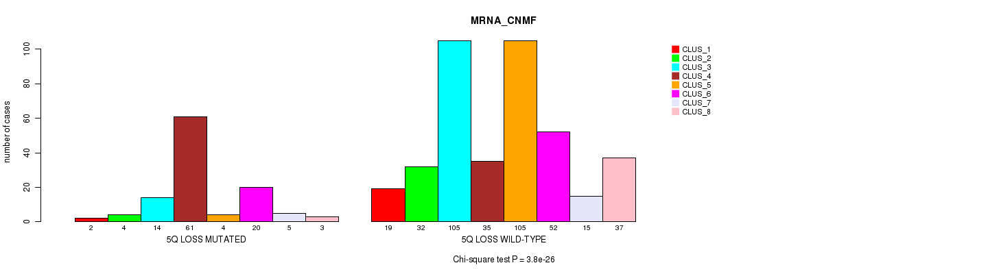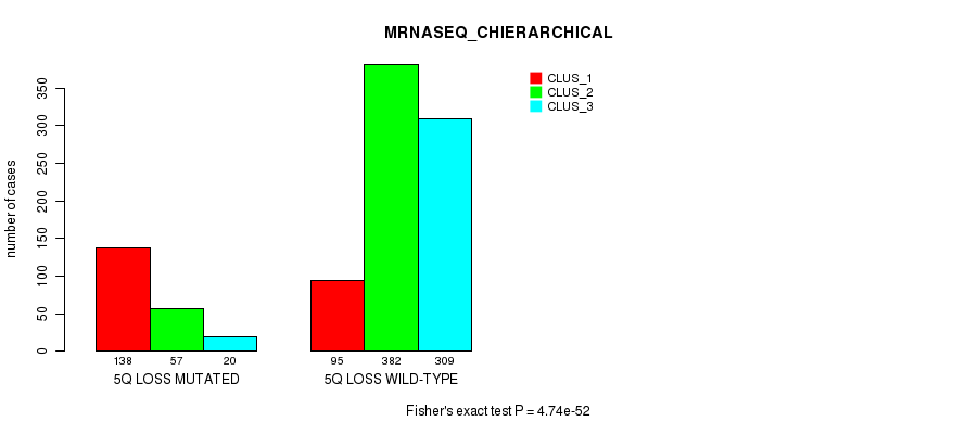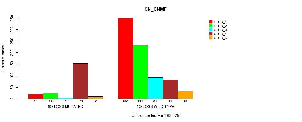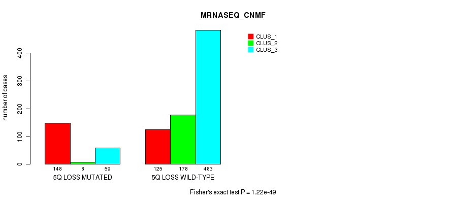 5q loss cnv correlated to 'MRNA_CNMF', 'MRNA_CHIERARCHICAL', 'CN_CNMF', 'METHLYATION_CNMF', 'RPPA_CNMF', 'RPPA_CHIERARCHICAL', 'MRNASEQ_CNMF', 'MRNASEQ_CHIERARCHICAL', 'MIRSEQ_CNMF', 'MIRSEQ_CHIERARCHICAL', 'MIRSEQ_MATURE_CNMF', and 'MIRSEQ_MATURE_CHIERARCHICAL'.