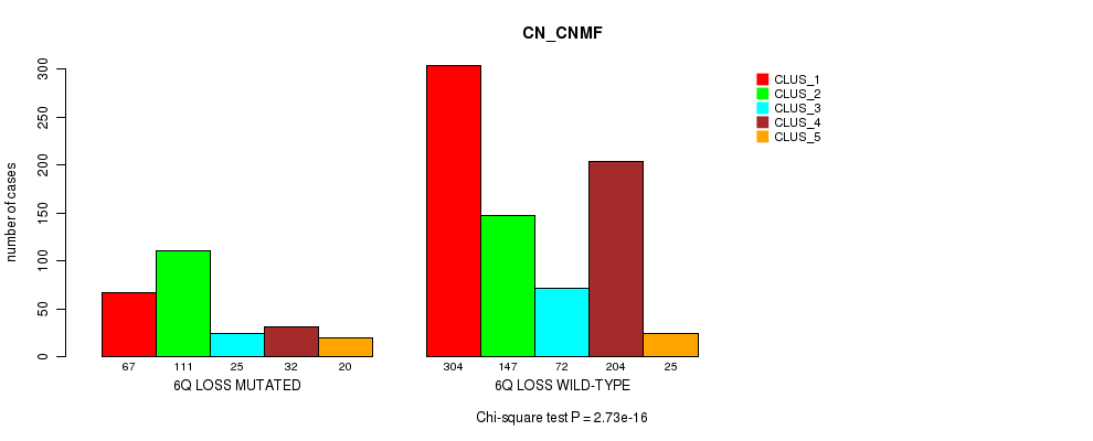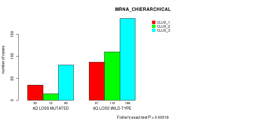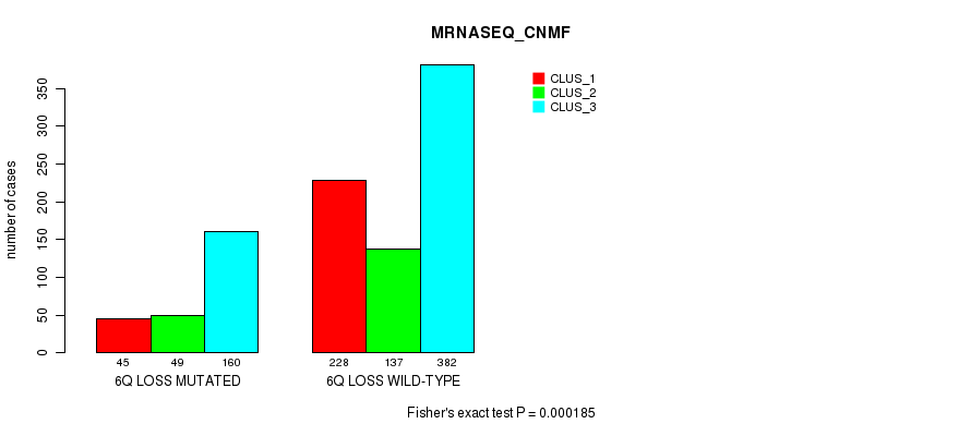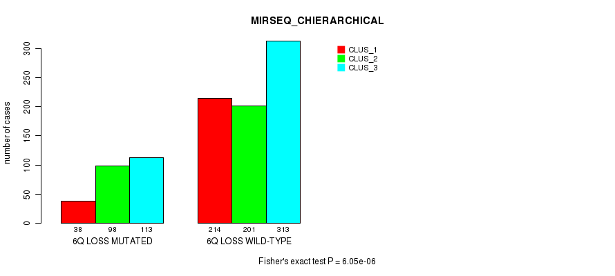 6q loss cnv correlated to 'MRNA_CHIERARCHICAL', 'CN_CNMF', 'METHLYATION_CNMF', 'MRNASEQ_CNMF', 'MRNASEQ_CHIERARCHICAL', and 'MIRSEQ_CHIERARCHICAL'.