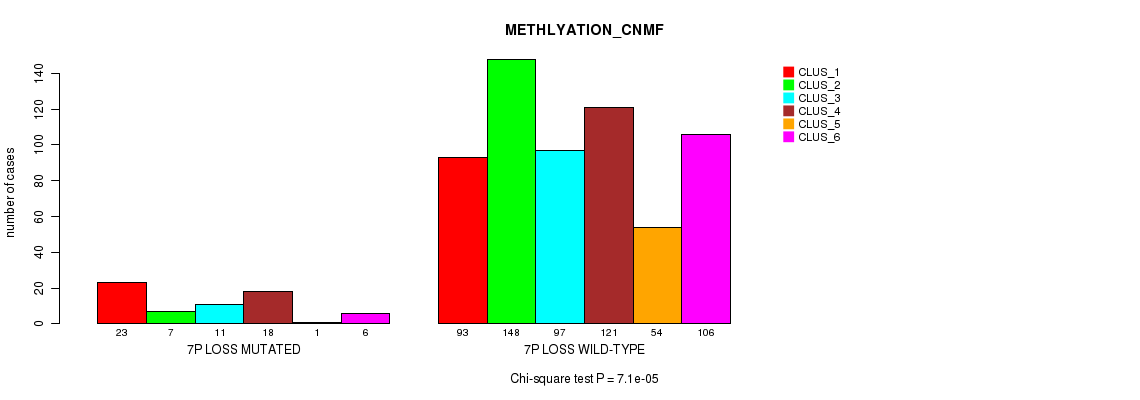 7p loss cnv correlated to 'CN_CNMF', 'METHLYATION_CNMF', 'MRNASEQ_CNMF', 'MRNASEQ_CHIERARCHICAL', 'MIRSEQ_CNMF', 'MIRSEQ_CHIERARCHICAL', 'MIRSEQ_MATURE_CNMF', and 'MIRSEQ_MATURE_CHIERARCHICAL'.