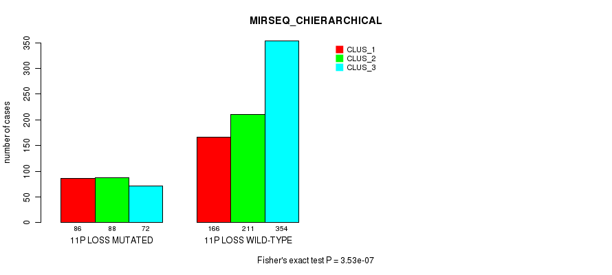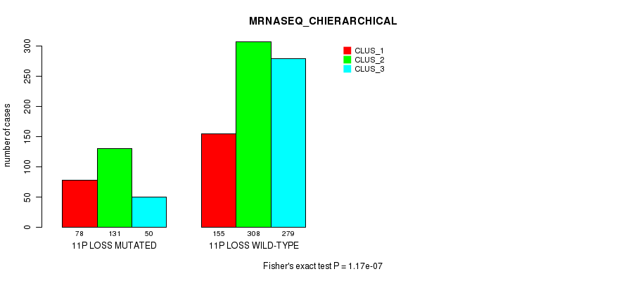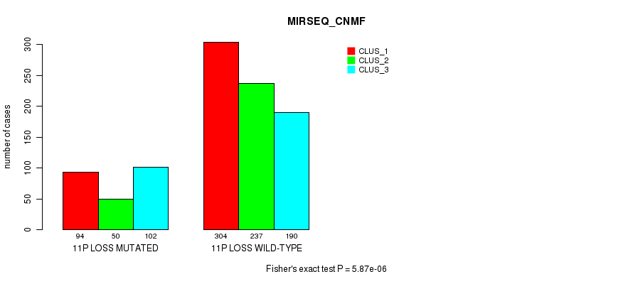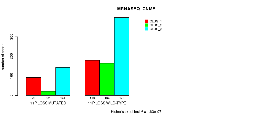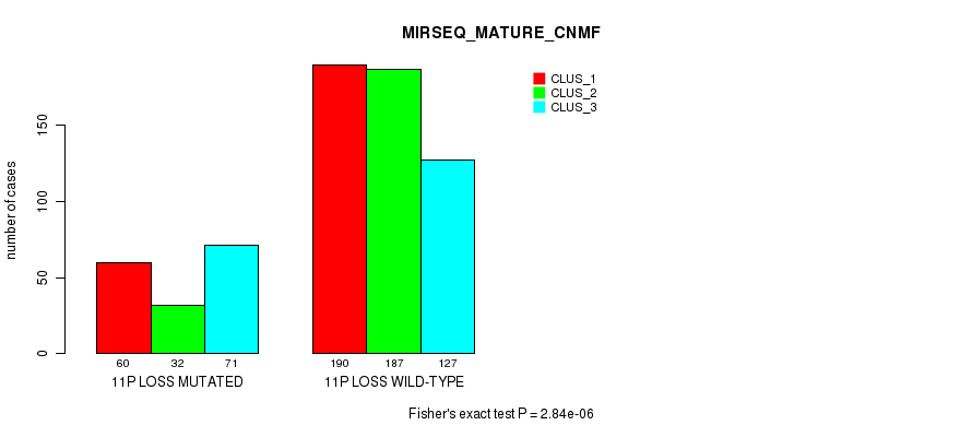 11p loss cnv correlated to 'CN_CNMF', 'METHLYATION_CNMF', 'MRNASEQ_CNMF', 'MRNASEQ_CHIERARCHICAL', 'MIRSEQ_CNMF', 'MIRSEQ_CHIERARCHICAL', 'MIRSEQ_MATURE_CNMF', and 'MIRSEQ_MATURE_CHIERARCHICAL'.