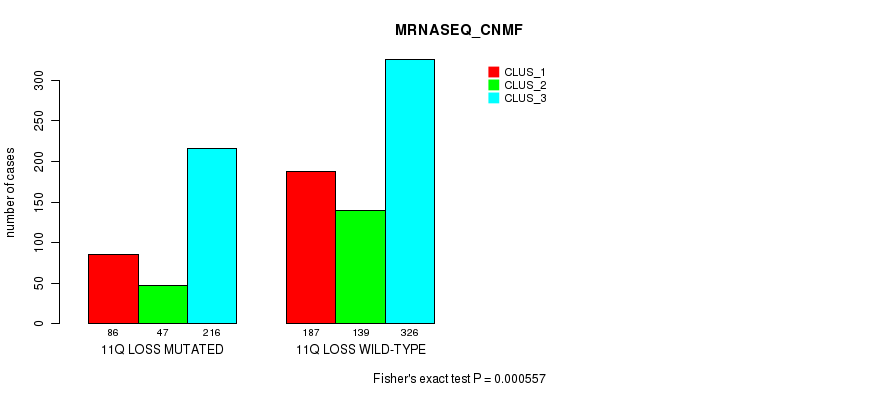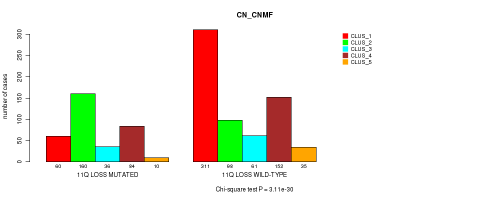 11q loss cnv correlated to 'MRNA_CNMF', 'CN_CNMF', 'METHLYATION_CNMF', 'MRNASEQ_CNMF', and 'MIRSEQ_CHIERARCHICAL'.