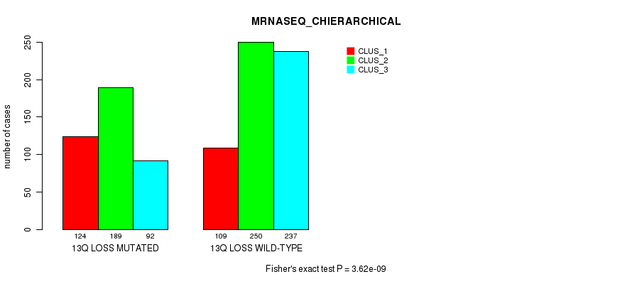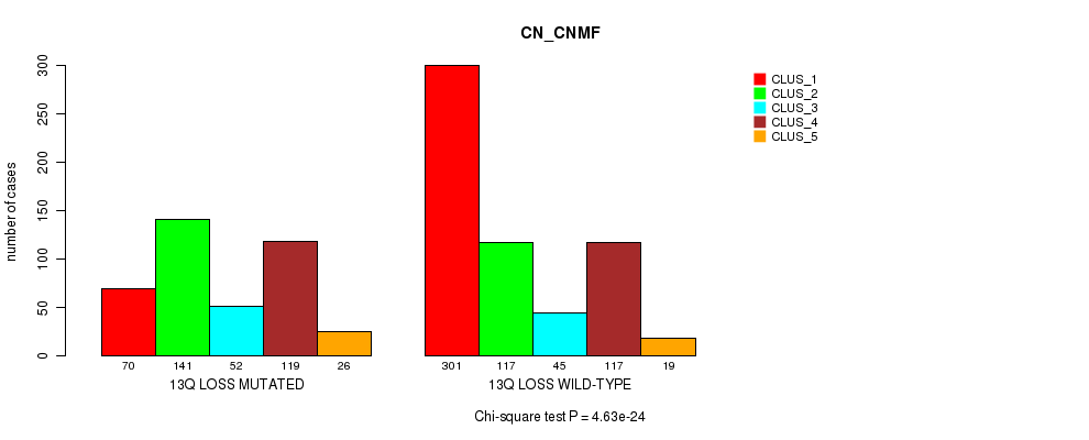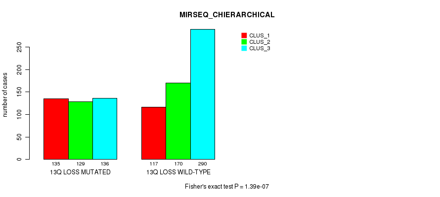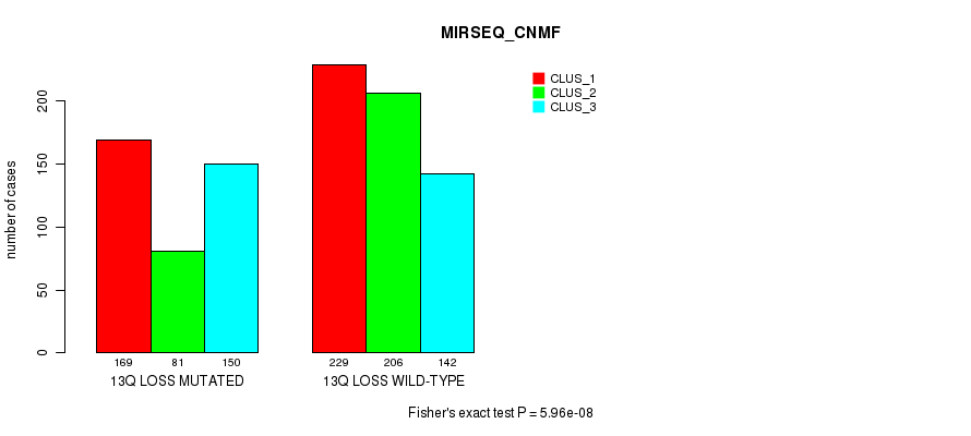 13q loss cnv correlated to 'MRNA_CNMF', 'MRNA_CHIERARCHICAL', 'CN_CNMF', 'METHLYATION_CNMF', 'MRNASEQ_CNMF', 'MRNASEQ_CHIERARCHICAL', 'MIRSEQ_CNMF', 'MIRSEQ_CHIERARCHICAL', 'MIRSEQ_MATURE_CNMF', and 'MIRSEQ_MATURE_CHIERARCHICAL'.