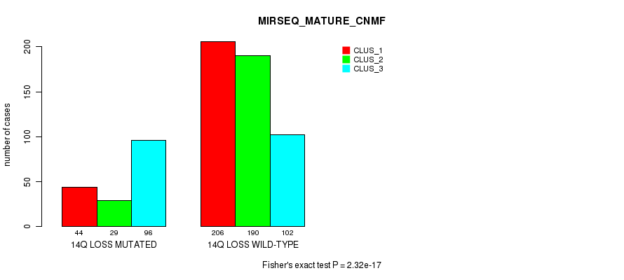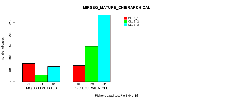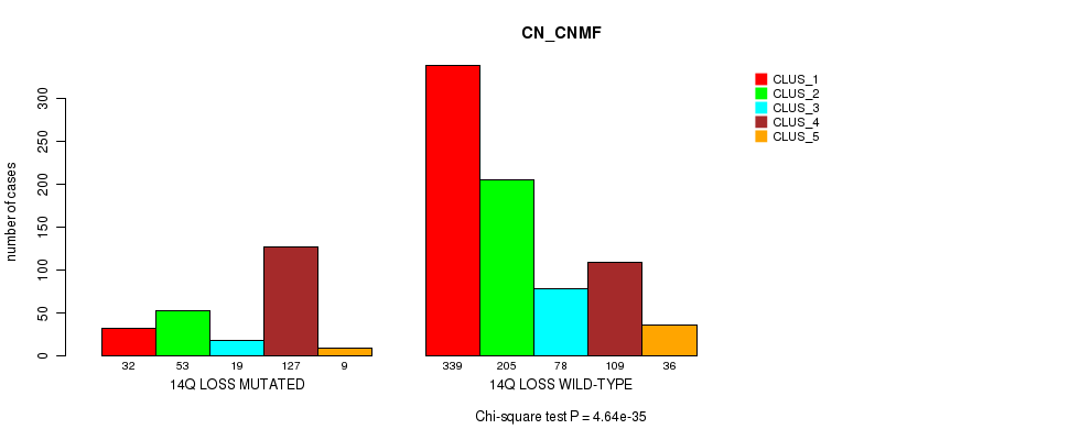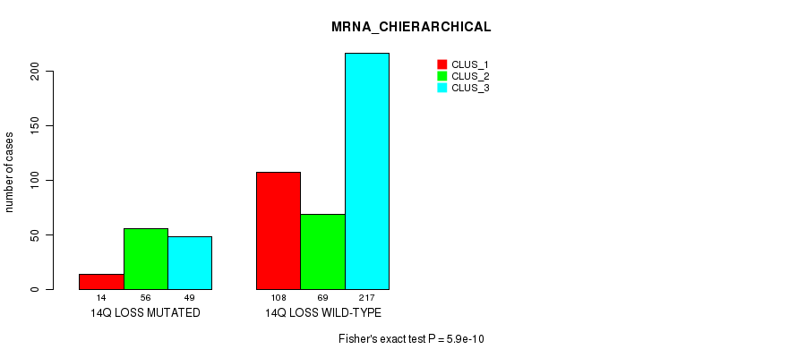 14q loss cnv correlated to 'MRNA_CNMF', 'MRNA_CHIERARCHICAL', 'CN_CNMF', 'METHLYATION_CNMF', 'RPPA_CNMF', 'RPPA_CHIERARCHICAL', 'MRNASEQ_CNMF', 'MRNASEQ_CHIERARCHICAL', 'MIRSEQ_CNMF', 'MIRSEQ_CHIERARCHICAL', 'MIRSEQ_MATURE_CNMF', and 'MIRSEQ_MATURE_CHIERARCHICAL'.