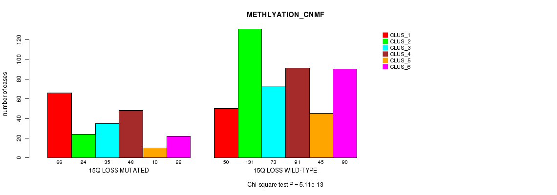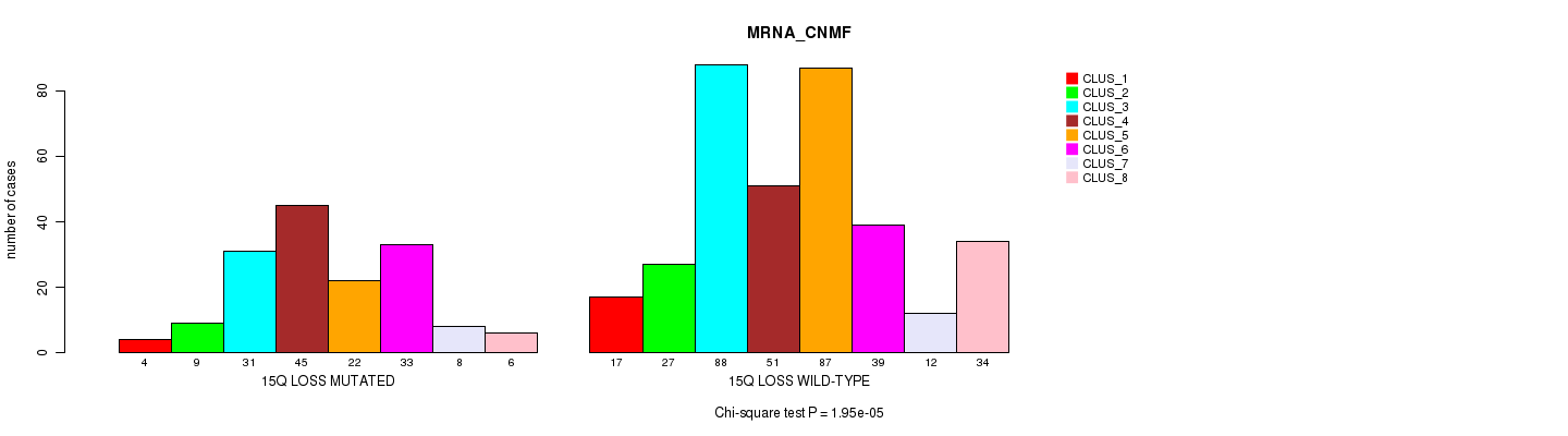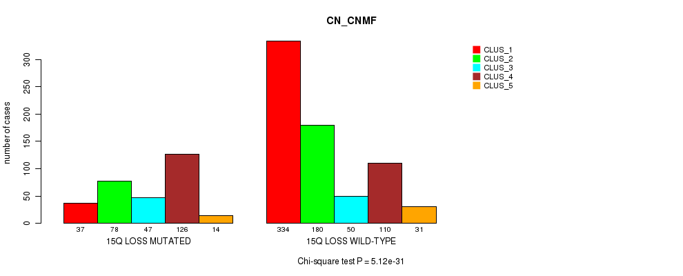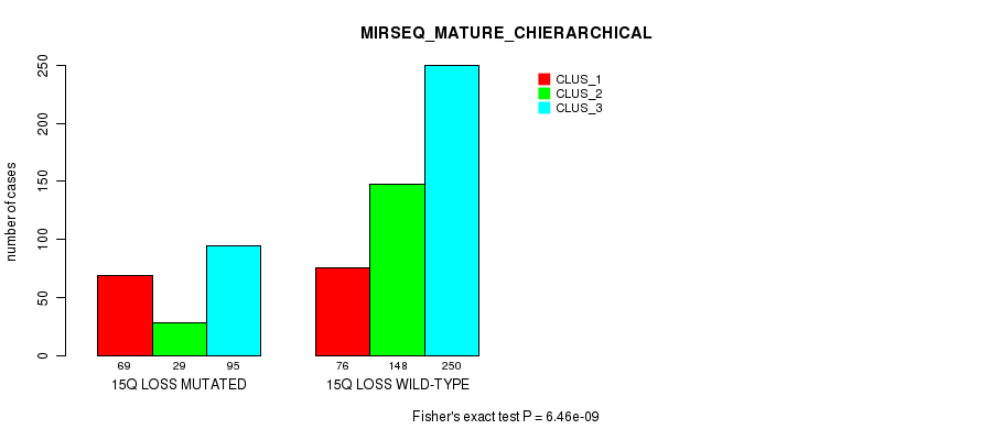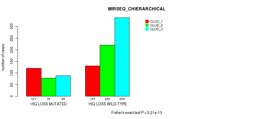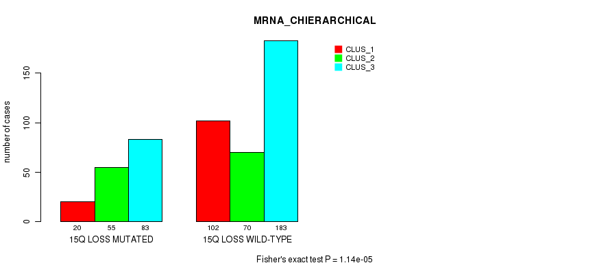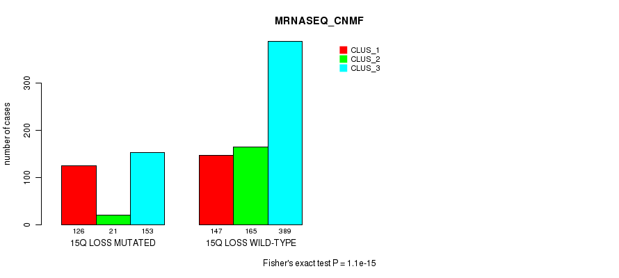 15q loss cnv correlated to 'MRNA_CNMF', 'MRNA_CHIERARCHICAL', 'CN_CNMF', 'METHLYATION_CNMF', 'MRNASEQ_CNMF', 'MRNASEQ_CHIERARCHICAL', 'MIRSEQ_CNMF', 'MIRSEQ_CHIERARCHICAL', 'MIRSEQ_MATURE_CNMF', and 'MIRSEQ_MATURE_CHIERARCHICAL'.