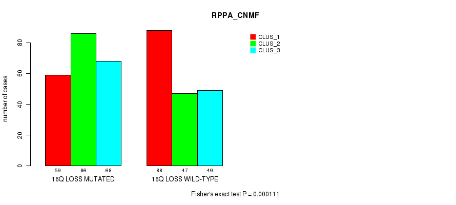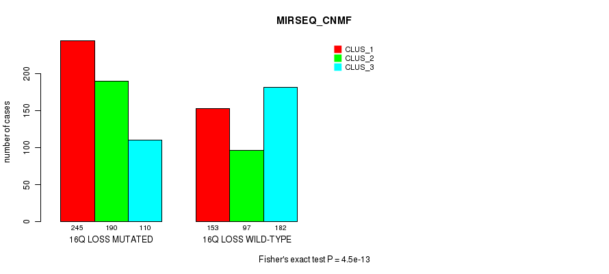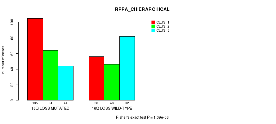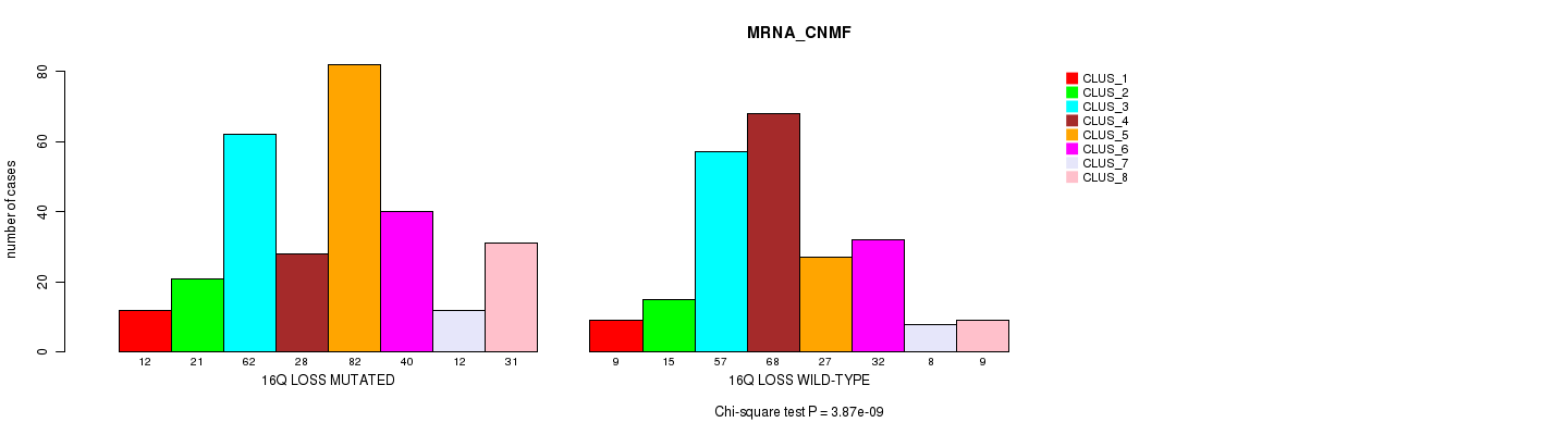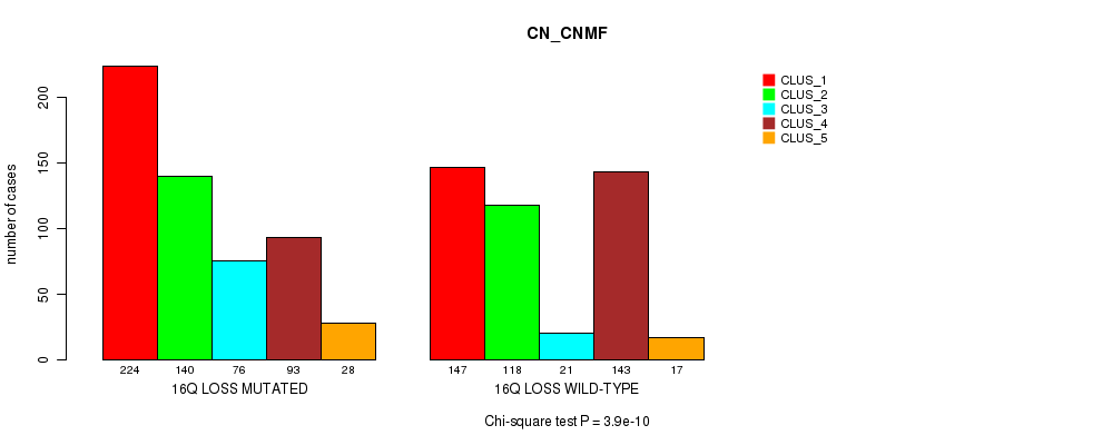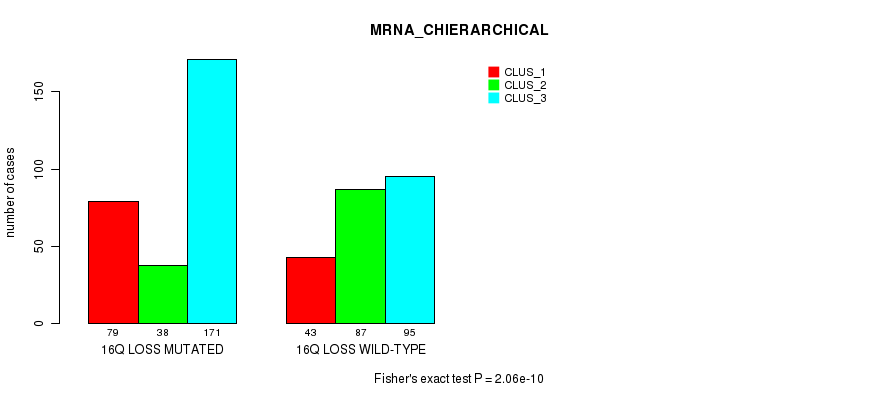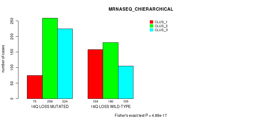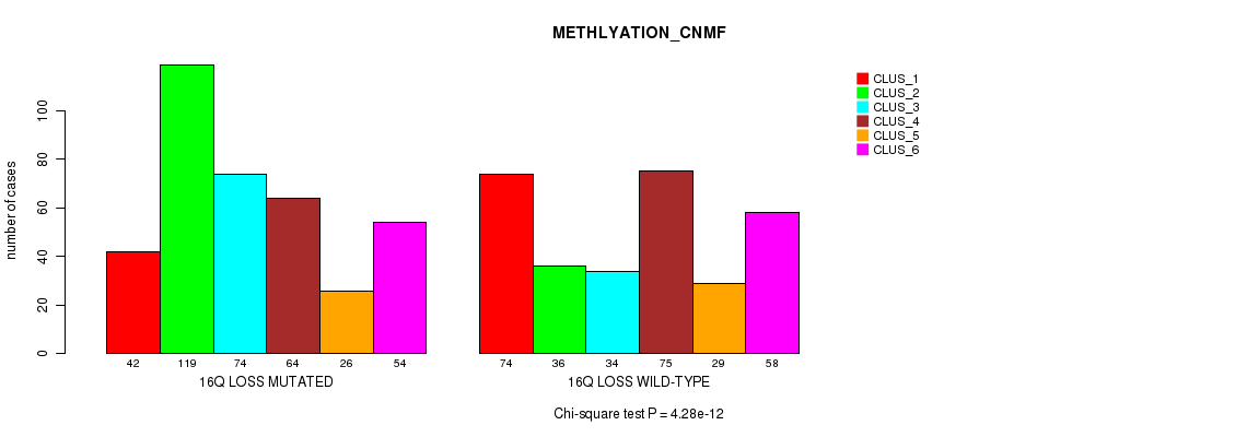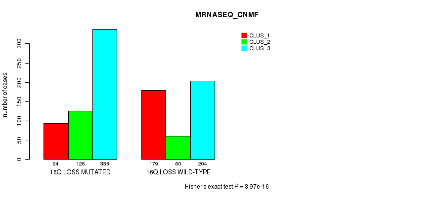 16q loss cnv correlated to 'MRNA_CNMF', 'MRNA_CHIERARCHICAL', 'CN_CNMF', 'METHLYATION_CNMF', 'RPPA_CNMF', 'RPPA_CHIERARCHICAL', 'MRNASEQ_CNMF', 'MRNASEQ_CHIERARCHICAL', 'MIRSEQ_CNMF', 'MIRSEQ_CHIERARCHICAL', 'MIRSEQ_MATURE_CNMF', and 'MIRSEQ_MATURE_CHIERARCHICAL'.