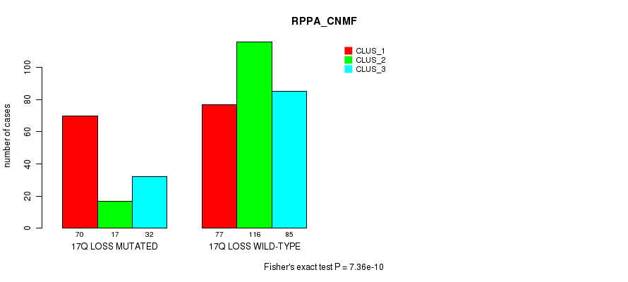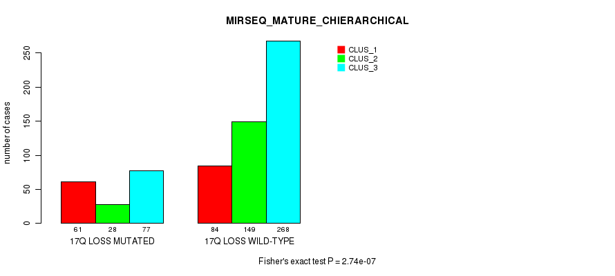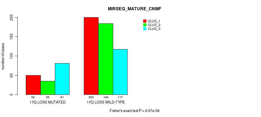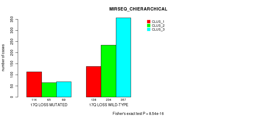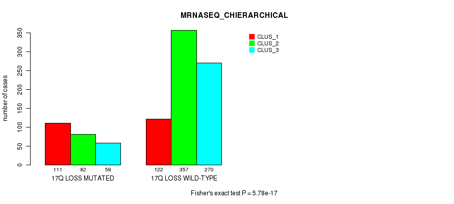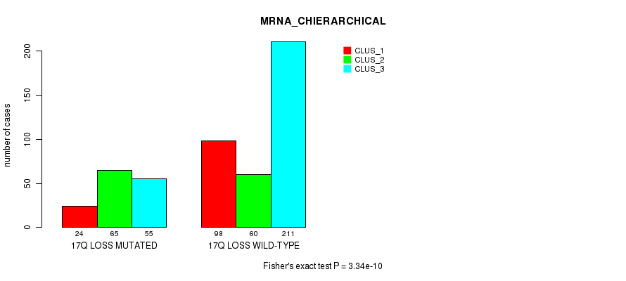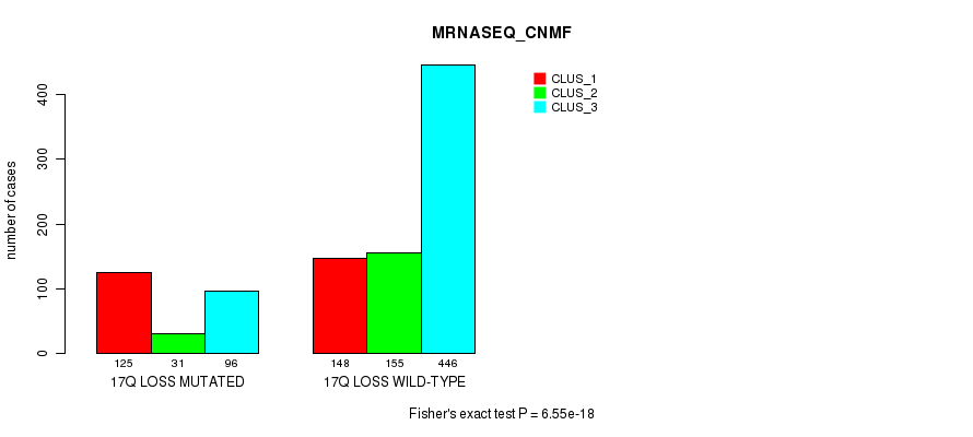17q loss cnv correlated to 'MRNA_CNMF', 'MRNA_CHIERARCHICAL', 'CN_CNMF', 'METHLYATION_CNMF', 'RPPA_CNMF', 'RPPA_CHIERARCHICAL', 'MRNASEQ_CNMF', 'MRNASEQ_CHIERARCHICAL', 'MIRSEQ_CNMF', 'MIRSEQ_CHIERARCHICAL', 'MIRSEQ_MATURE_CNMF', and 'MIRSEQ_MATURE_CHIERARCHICAL'.