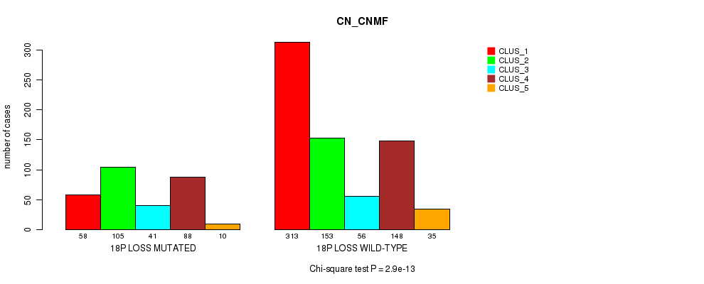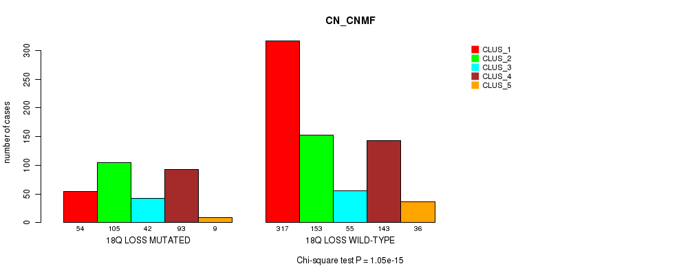 18q loss cnv correlated to 'MRNA_CNMF', 'CN_CNMF', 'METHLYATION_CNMF', 'MRNASEQ_CNMF', and 'MIRSEQ_MATURE_CNMF'.