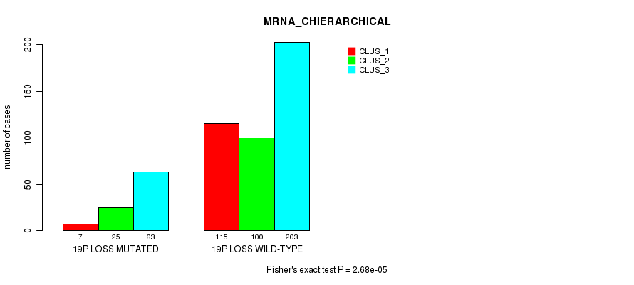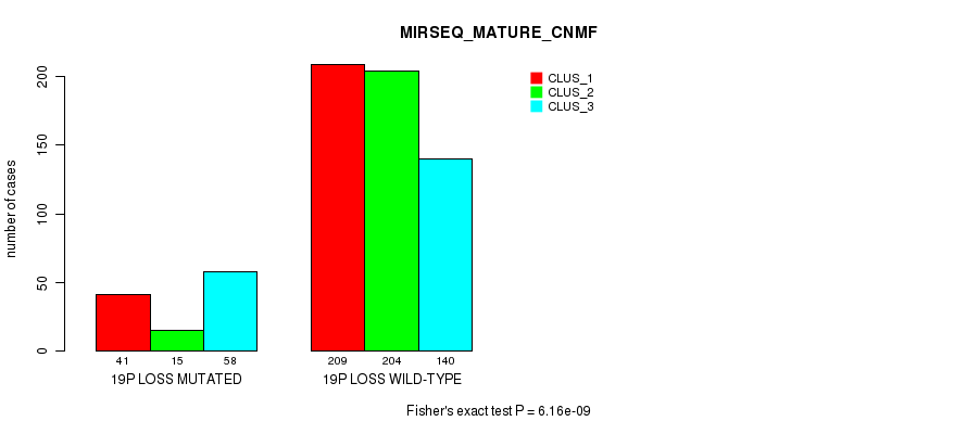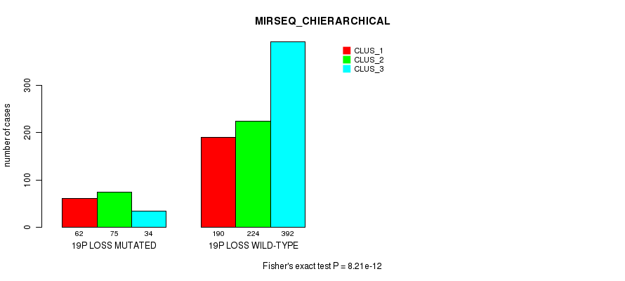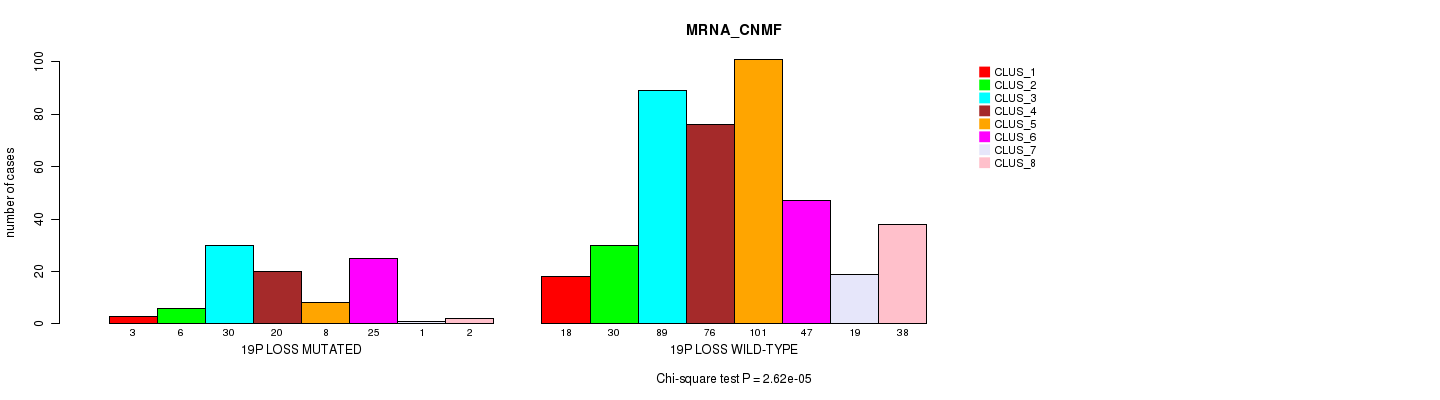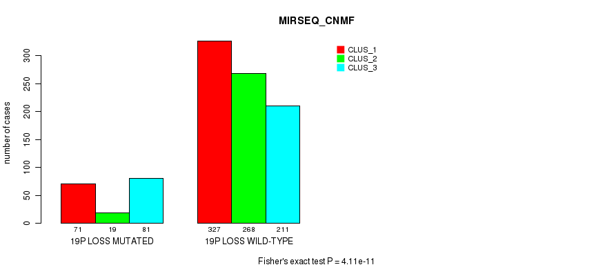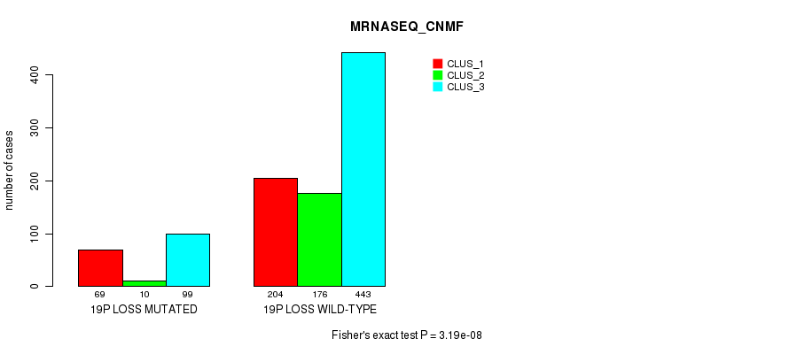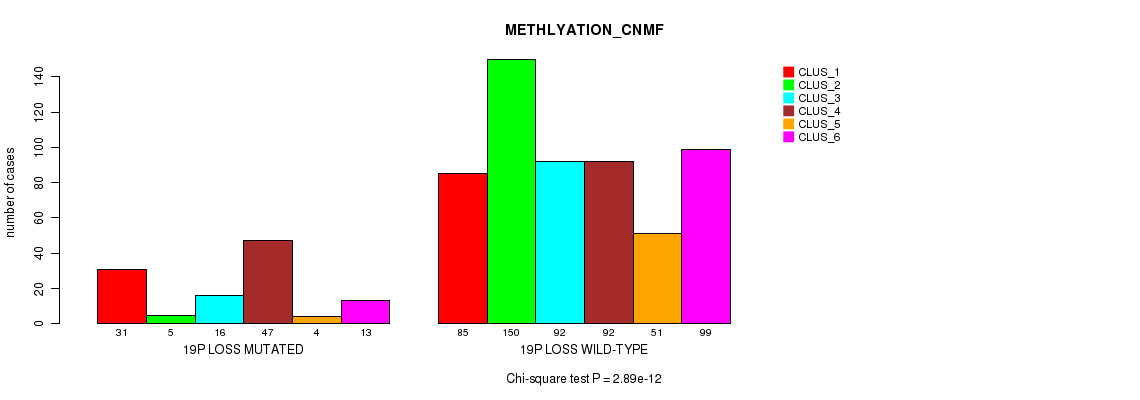 19p loss cnv correlated to 'MRNA_CNMF', 'MRNA_CHIERARCHICAL', 'CN_CNMF', 'METHLYATION_CNMF', 'MRNASEQ_CNMF', 'MRNASEQ_CHIERARCHICAL', 'MIRSEQ_CNMF', 'MIRSEQ_CHIERARCHICAL', 'MIRSEQ_MATURE_CNMF', and 'MIRSEQ_MATURE_CHIERARCHICAL'.