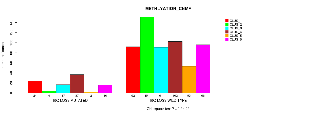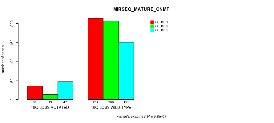 19q loss cnv correlated to 'MRNA_CHIERARCHICAL', 'CN_CNMF', 'METHLYATION_CNMF', 'MRNASEQ_CNMF', 'MRNASEQ_CHIERARCHICAL', 'MIRSEQ_CNMF', 'MIRSEQ_CHIERARCHICAL', and 'MIRSEQ_MATURE_CNMF'.