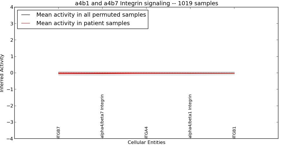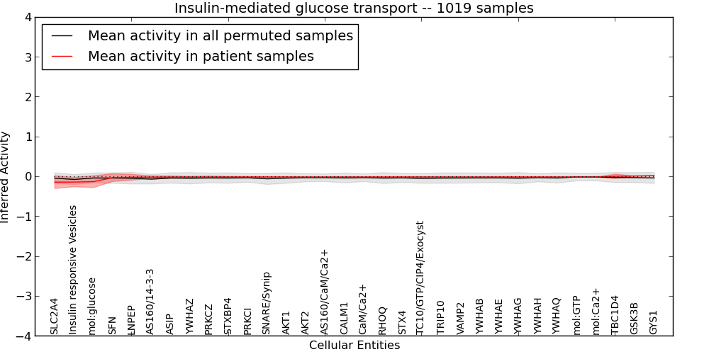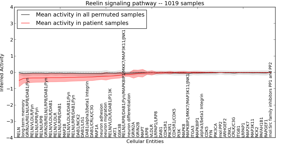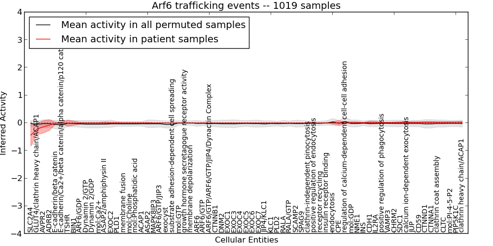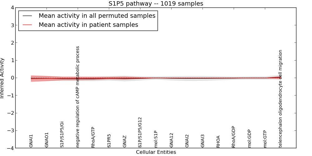 Figure S131. Get High-res Image This plot shows pathway concept perturbations across all samples against a permutation model. The concepts along the x-axis are sorted by lowest to highest mean activity for the real patient samples. Mean inferred activities are plotted along the y-axis as a colored band showing the average level and one standard deviation range. Real samples are shown in red and permuted samples in black.