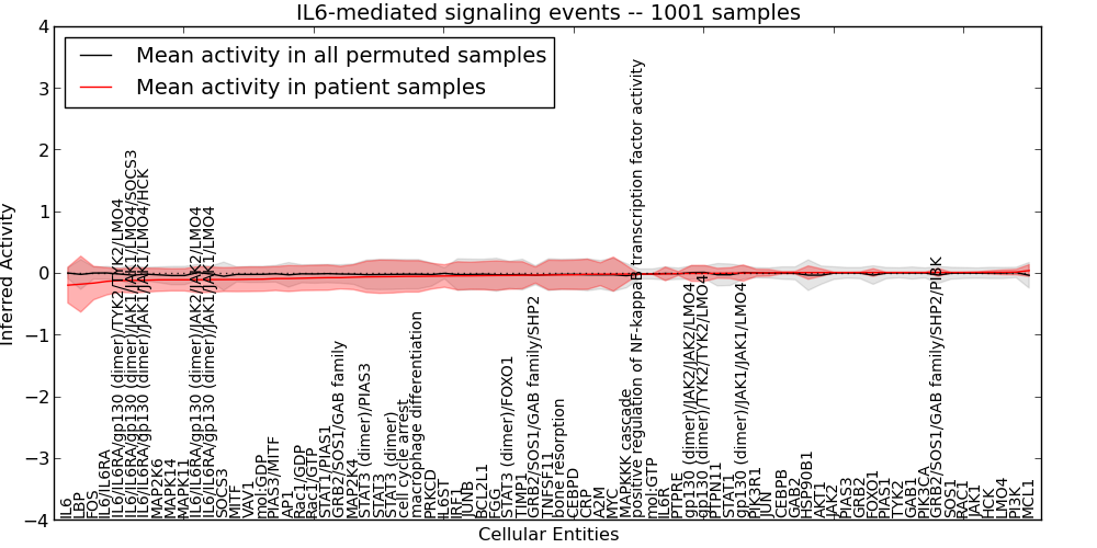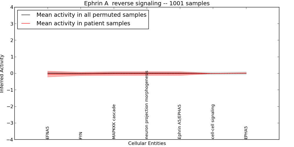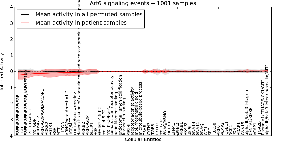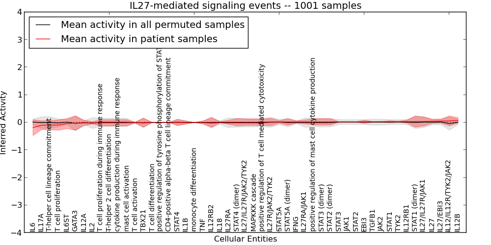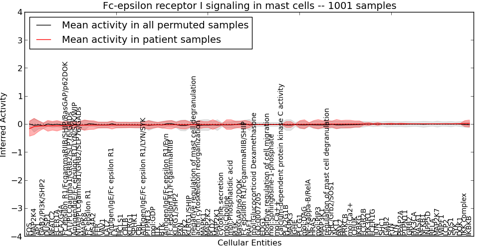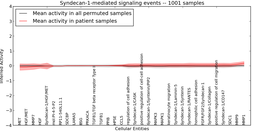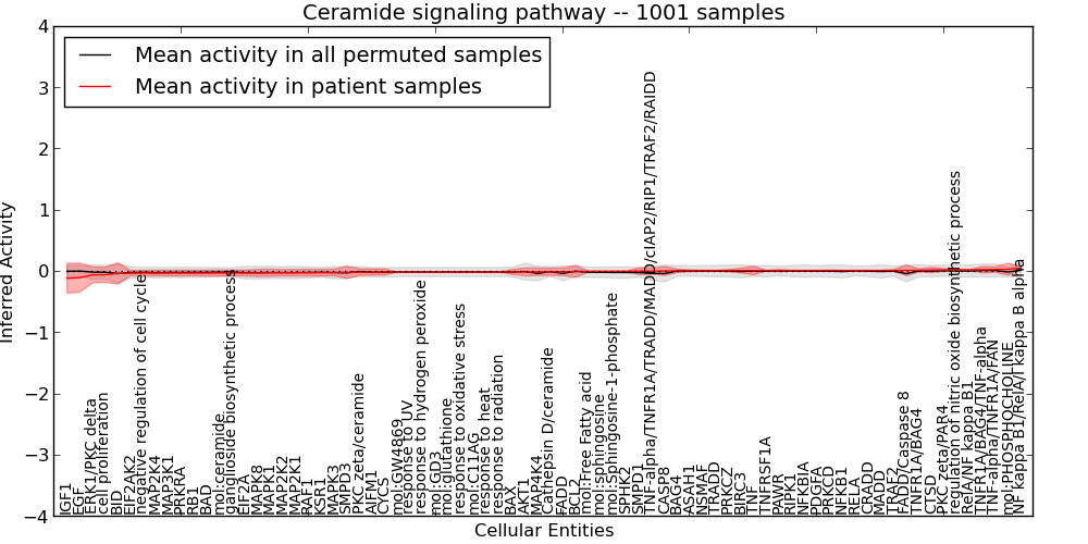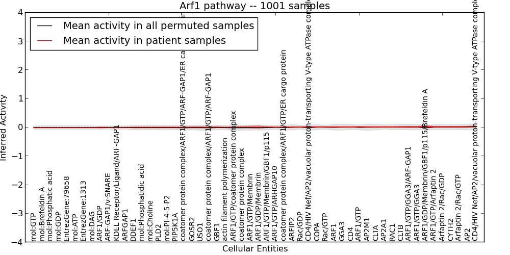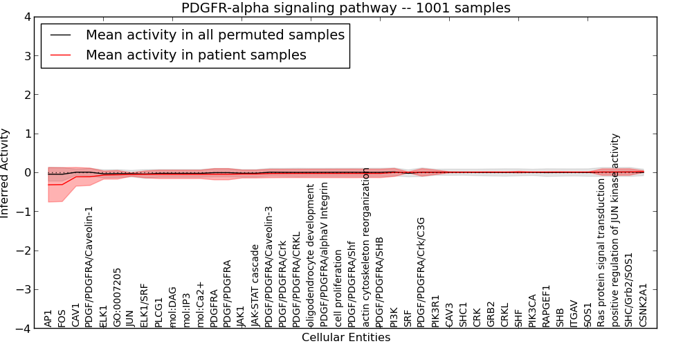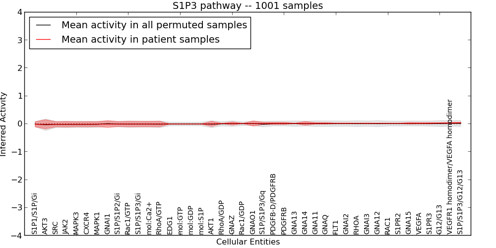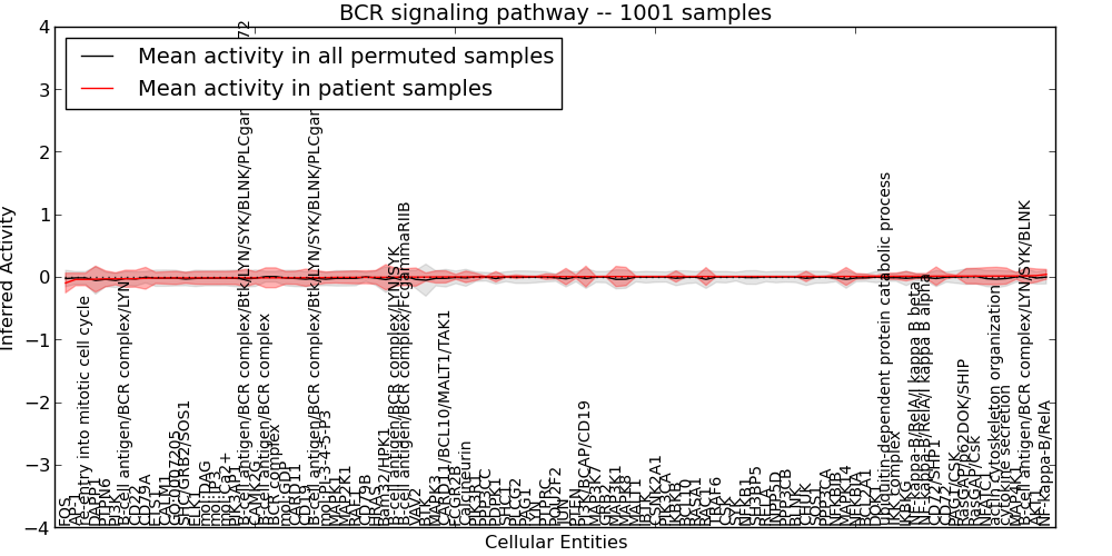 Figure S131. Get High-res Image This plot shows pathway concept perturbations across all samples against a permutation model. The concepts along the x-axis are sorted by lowest to highest mean activity for the real patient samples. Mean inferred activities are plotted along the y-axis as a colored band showing the average level and one standard deviation range. Real samples are shown in red and permuted samples in black.