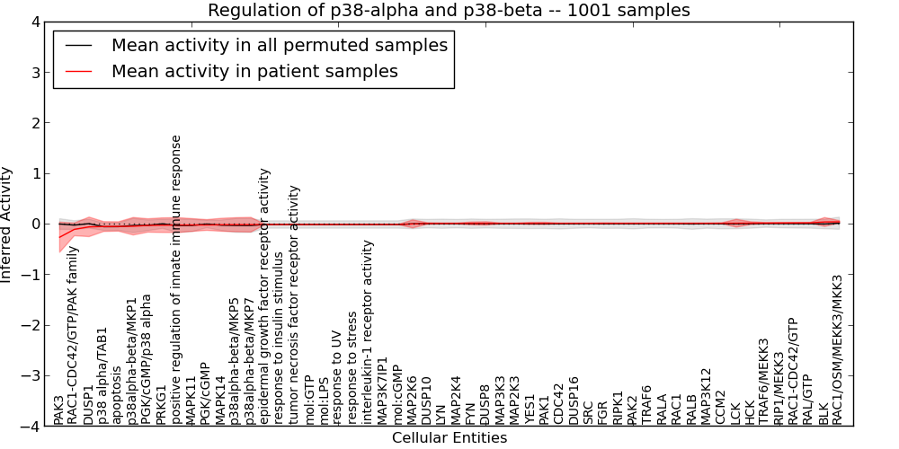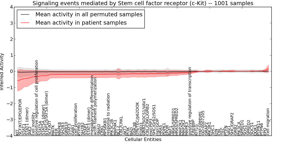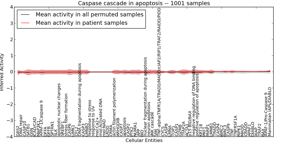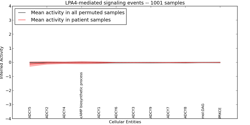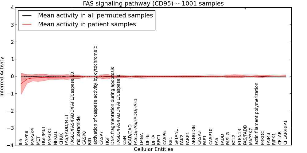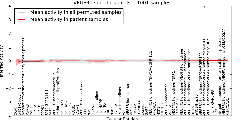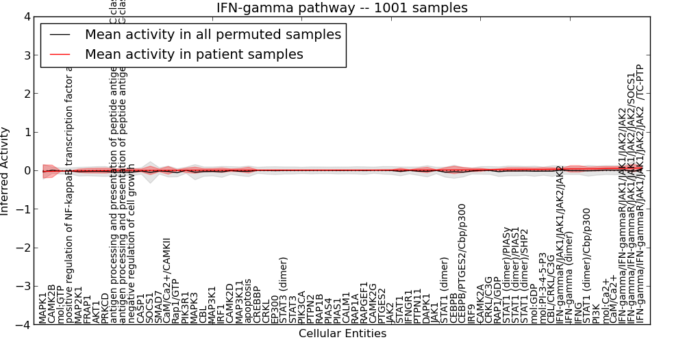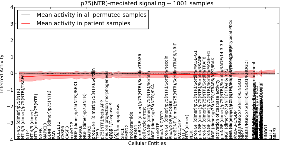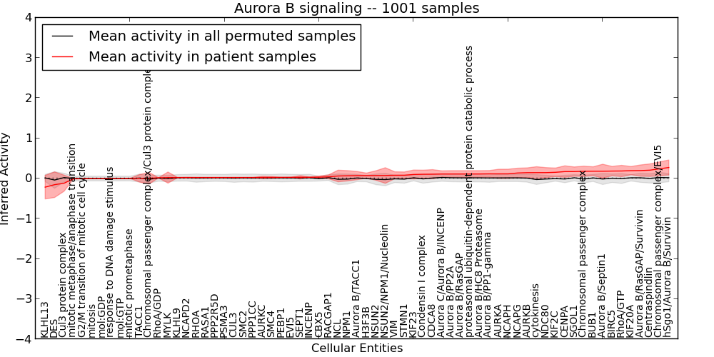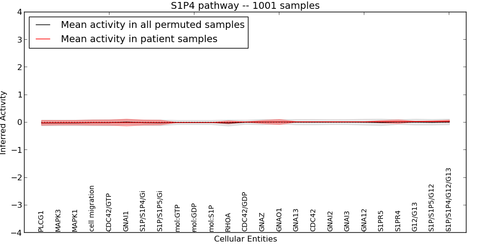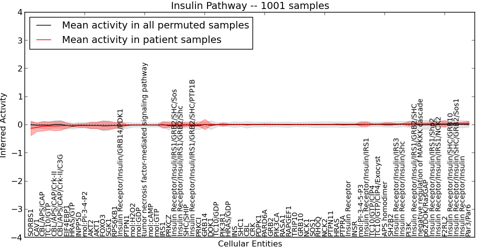 Figure S131. Get High-res Image This plot shows pathway concept perturbations across all samples against a permutation model. The concepts along the x-axis are sorted by lowest to highest mean activity for the real patient samples. Mean inferred activities are plotted along the y-axis as a colored band showing the average level and one standard deviation range. Real samples are shown in red and permuted samples in black.