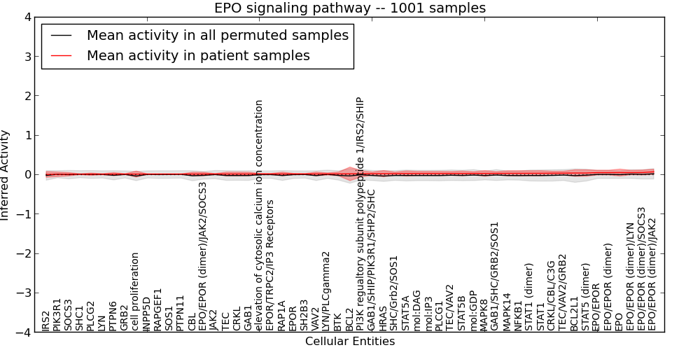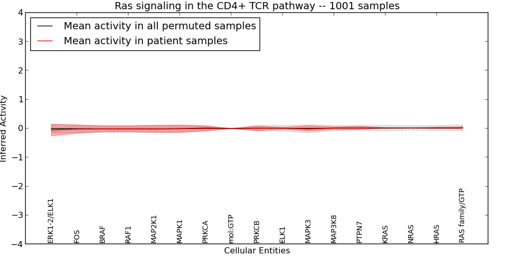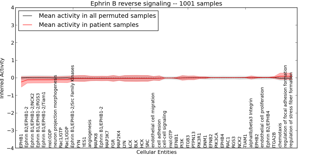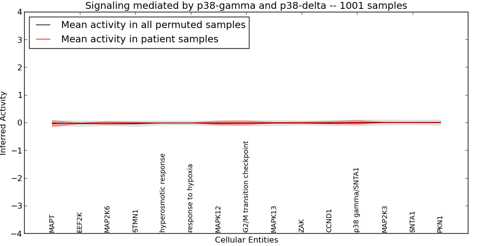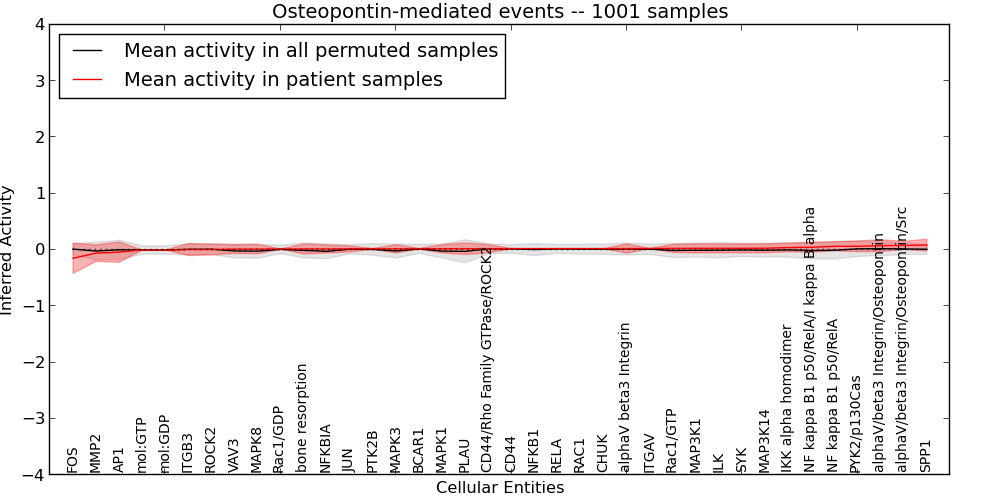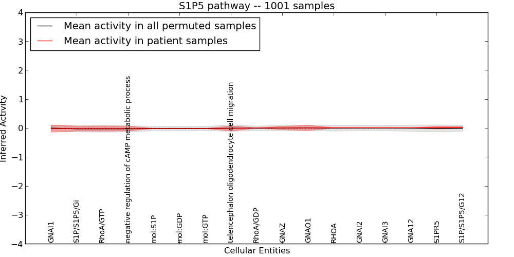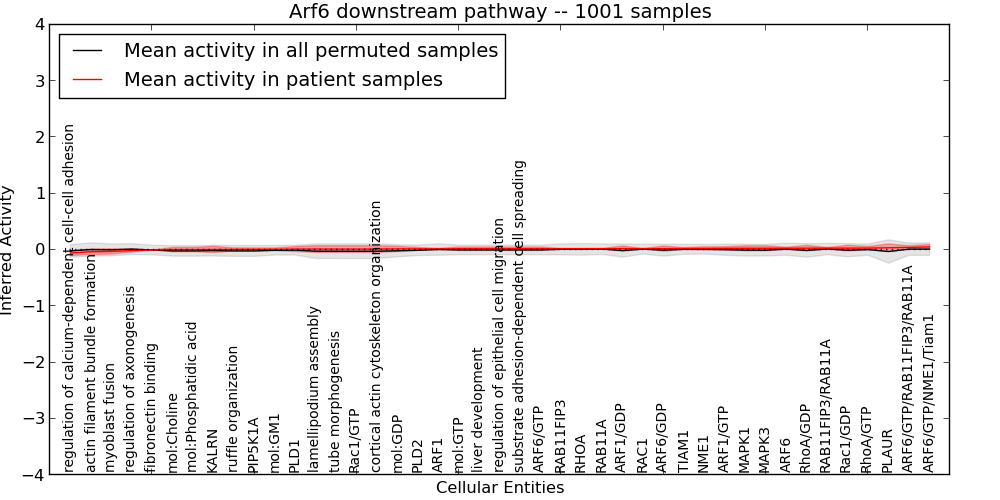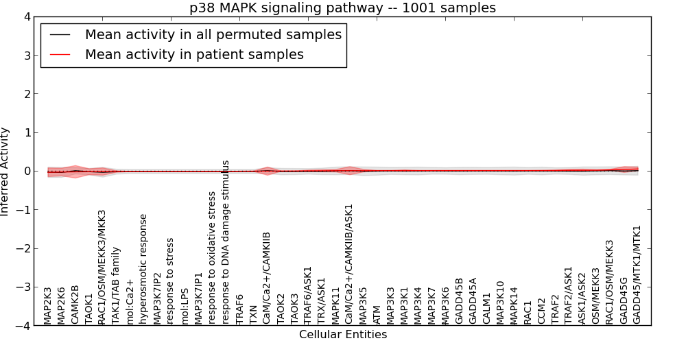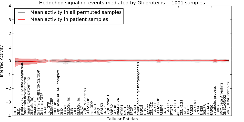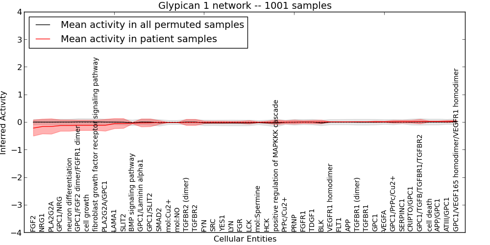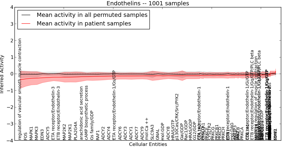 Figure S131. Get High-res Image This plot shows pathway concept perturbations across all samples against a permutation model. The concepts along the x-axis are sorted by lowest to highest mean activity for the real patient samples. Mean inferred activities are plotted along the y-axis as a colored band showing the average level and one standard deviation range. Real samples are shown in red and permuted samples in black.
