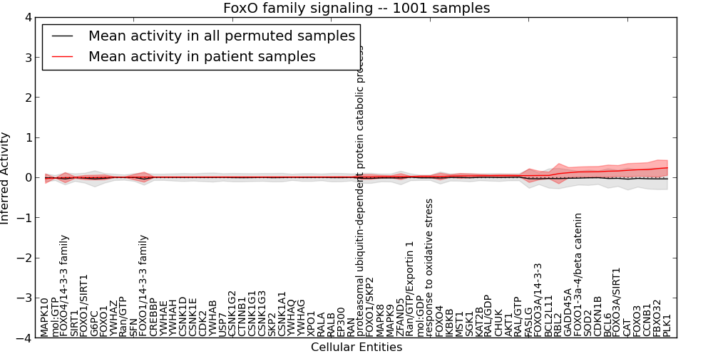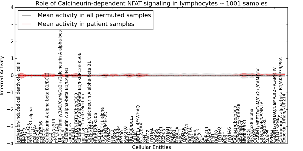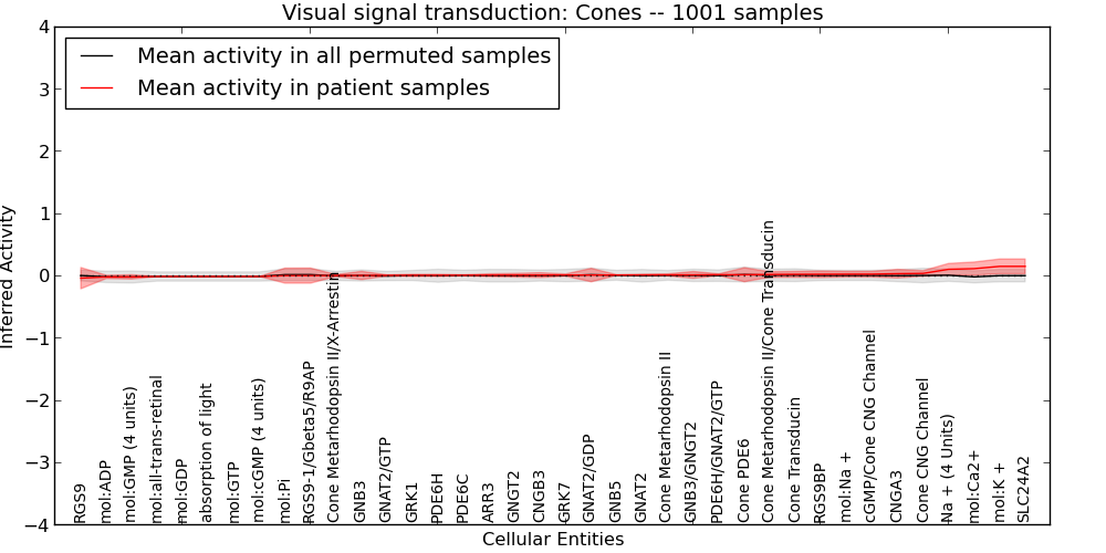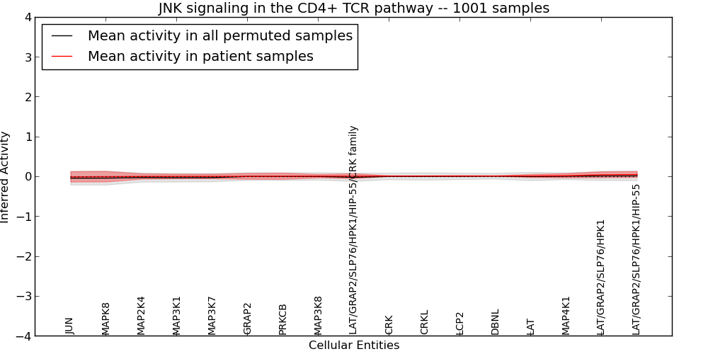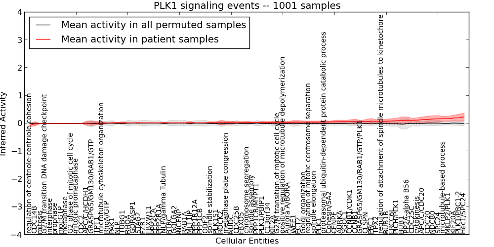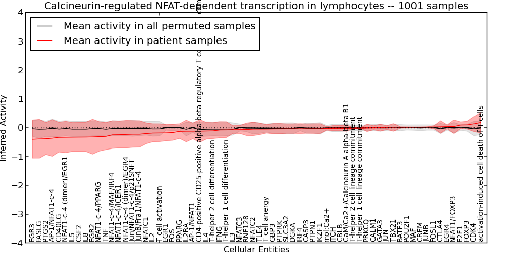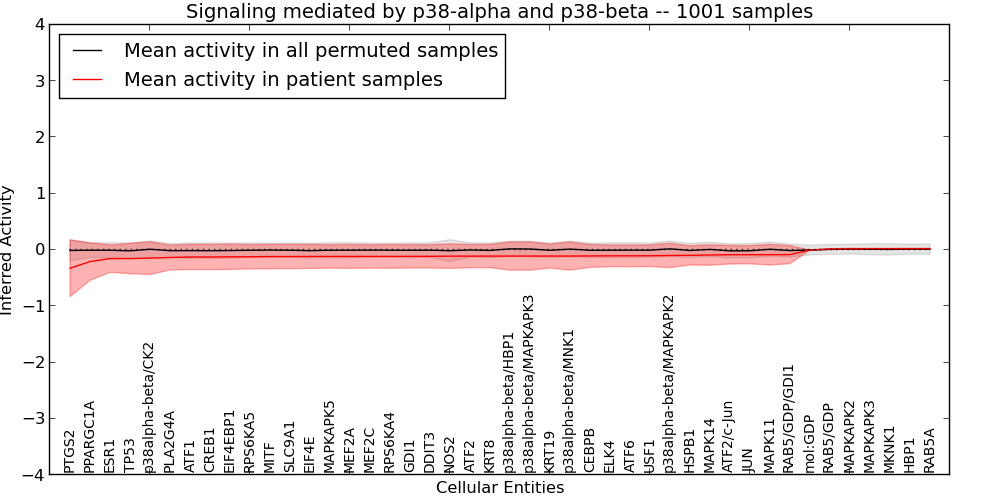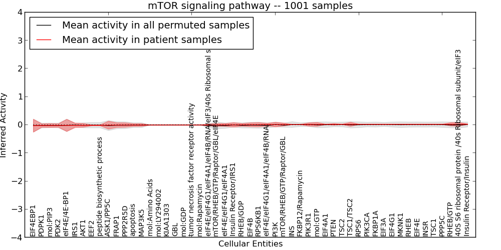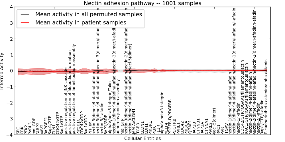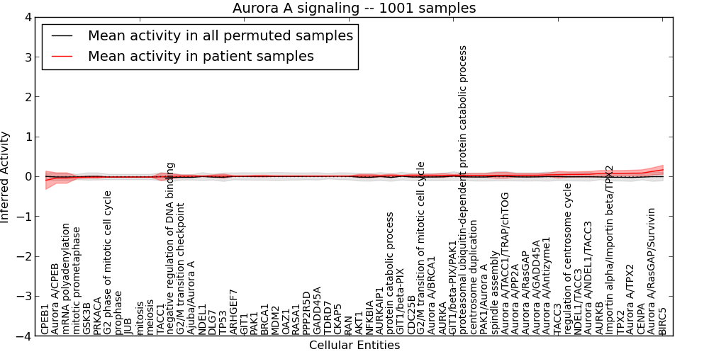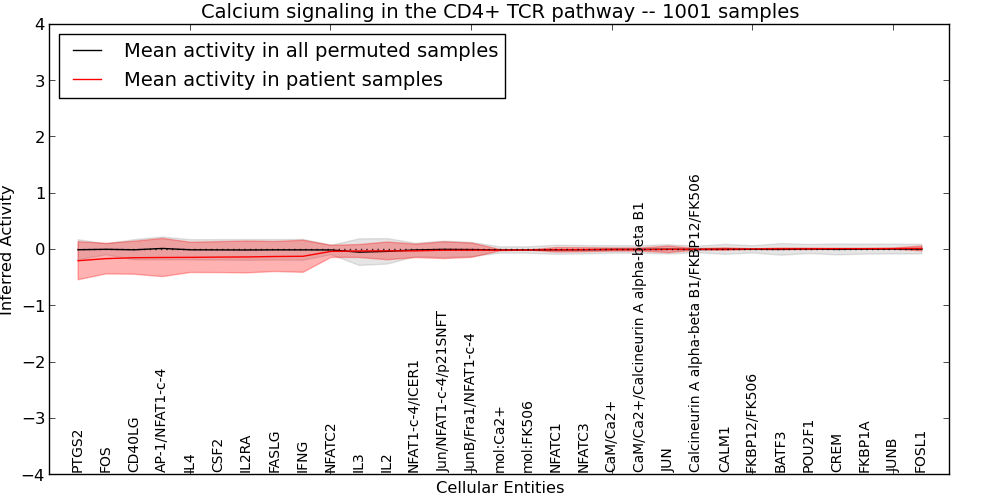 Figure S131. Get High-res Image This plot shows pathway concept perturbations across all samples against a permutation model. The concepts along the x-axis are sorted by lowest to highest mean activity for the real patient samples. Mean inferred activities are plotted along the y-axis as a colored band showing the average level and one standard deviation range. Real samples are shown in red and permuted samples in black.
