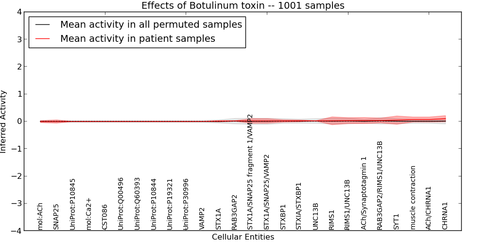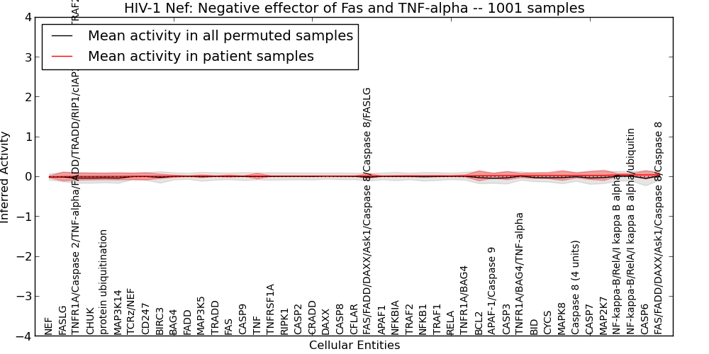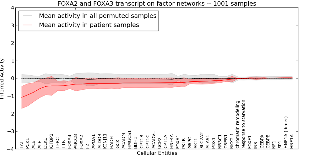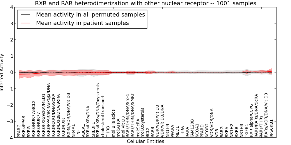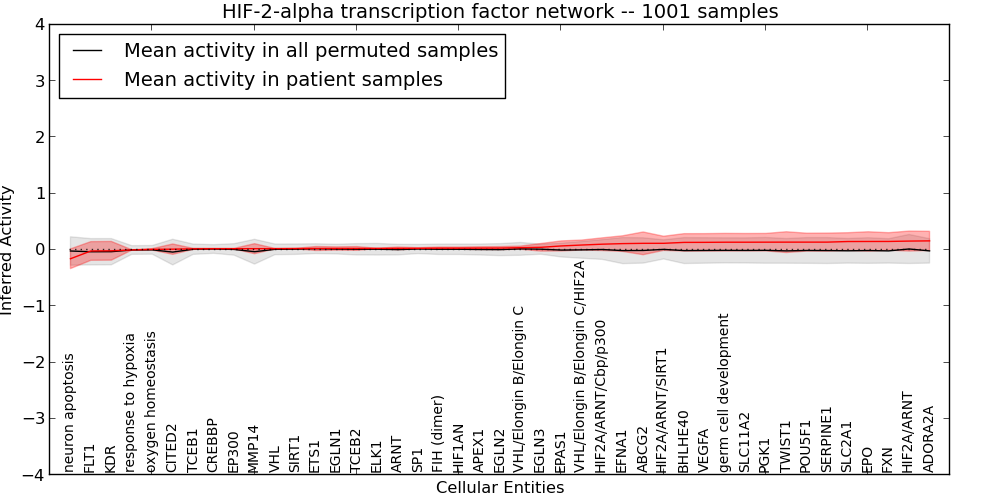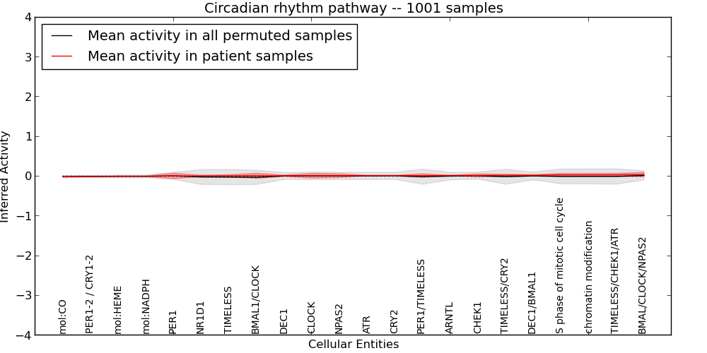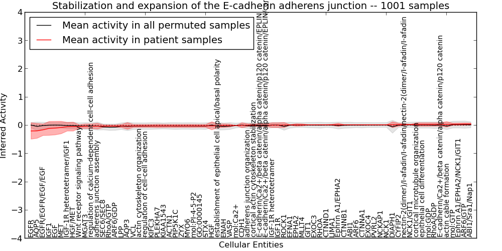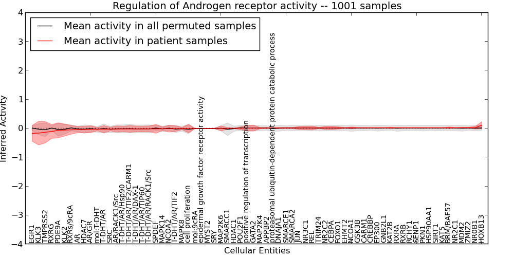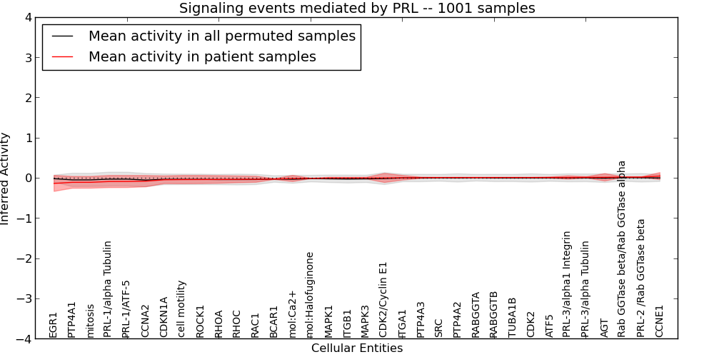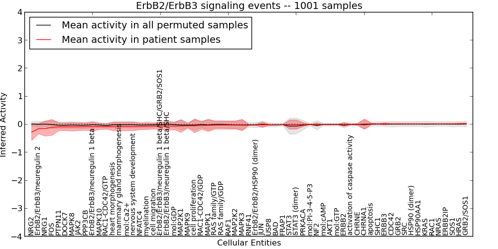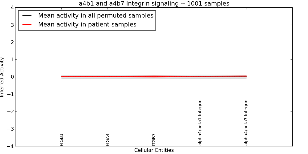 Figure S131. Get High-res Image This plot shows pathway concept perturbations across all samples against a permutation model. The concepts along the x-axis are sorted by lowest to highest mean activity for the real patient samples. Mean inferred activities are plotted along the y-axis as a colored band showing the average level and one standard deviation range. Real samples are shown in red and permuted samples in black.