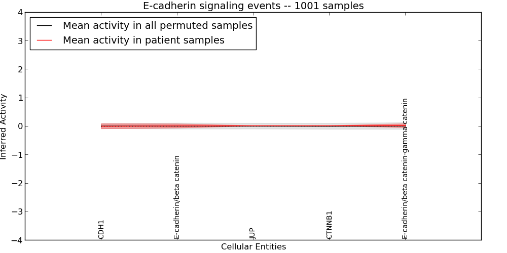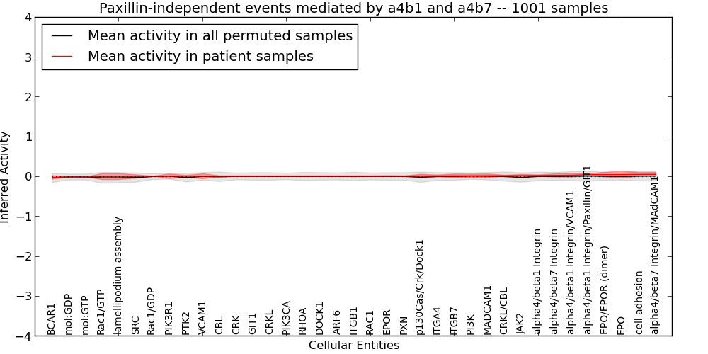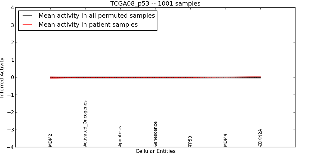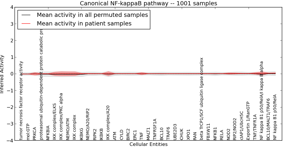 The significance of the IPL obtained for each concept in each patient sample is assessed using a permutation analysis. Importantly, the permutation analysis preserves data tuples so as to preserve any implicit correlations between the different data modalities. For example, genes that are deleted have concomitantly lower expression levels. Preserving the copy number and expression pairs therefore retains this data property. The simulation therefore makes "null samples" by permuting data tuples across all of the genes in the genome so that each gene in a null sample is associated with a random tuple of another gene with equal probability. This approach has the added benefit of preserving the pathway structure so that every observed IPL can be compared to a distribution of random IPLs derived from exactly the same interaction context. PARADIGM inferences are then obtained for 1000 "null" patients and serve as a background distribution to contrast the observed IPLs against. Pathway concepts are excluded from further analysis if they did not obtain a minimum IPL of 0.5 in any patient sample both observed or simulated.