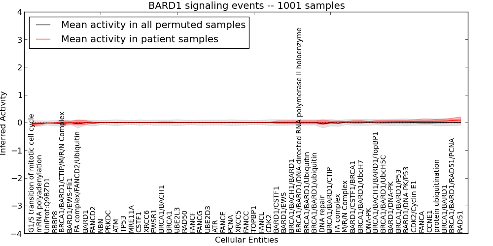 Figure S129. Get High-res Image This plot shows pathway concept perturbations across all samples against a permutation model. The concepts along the x-axis are sorted by lowest to highest mean activity for the real patient samples. Mean inferred activities are plotted along the y-axis as a colored band showing the average level and one standard deviation range. Real samples are shown in red and permuted samples in black.