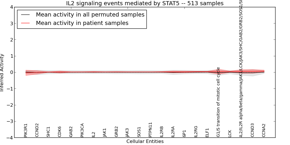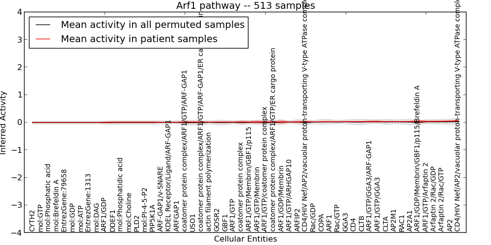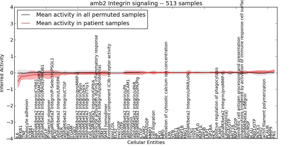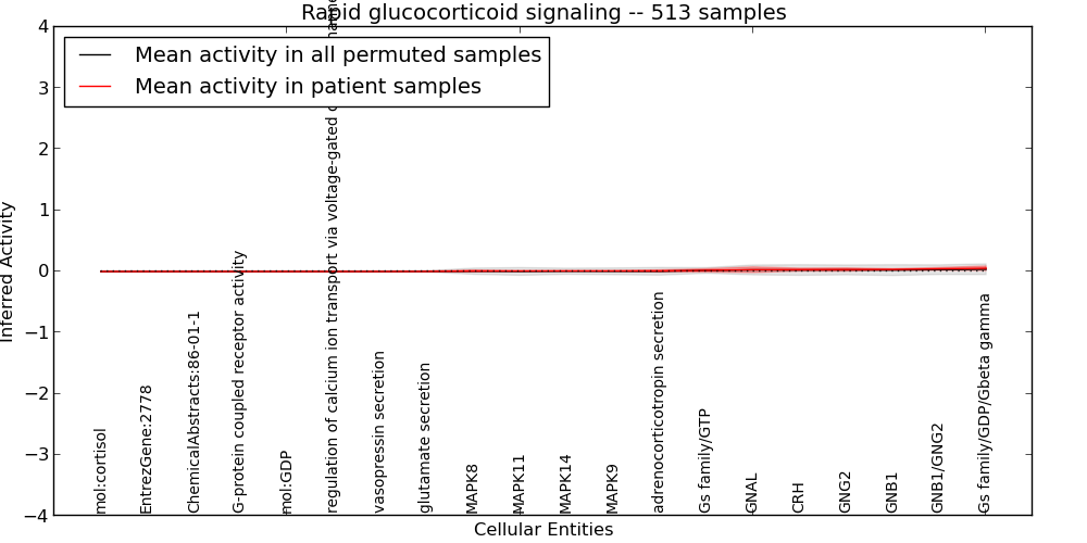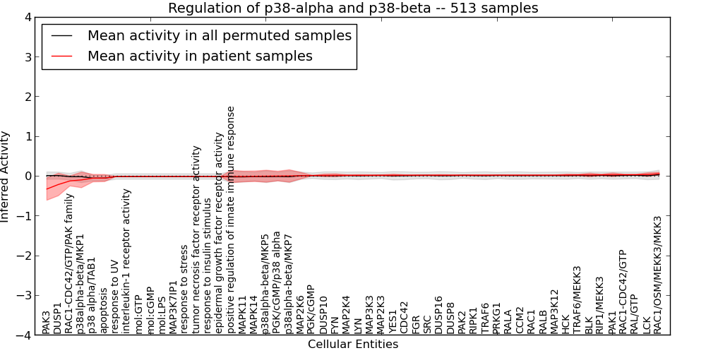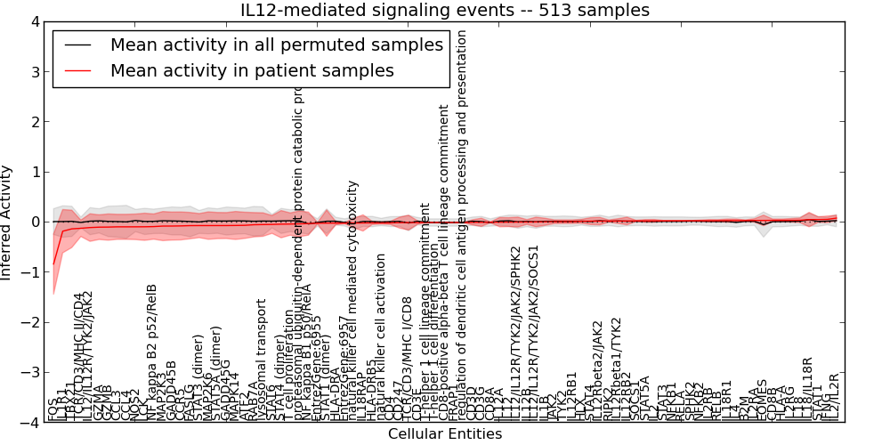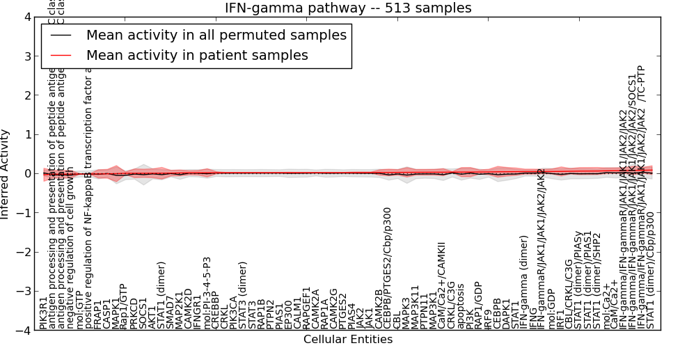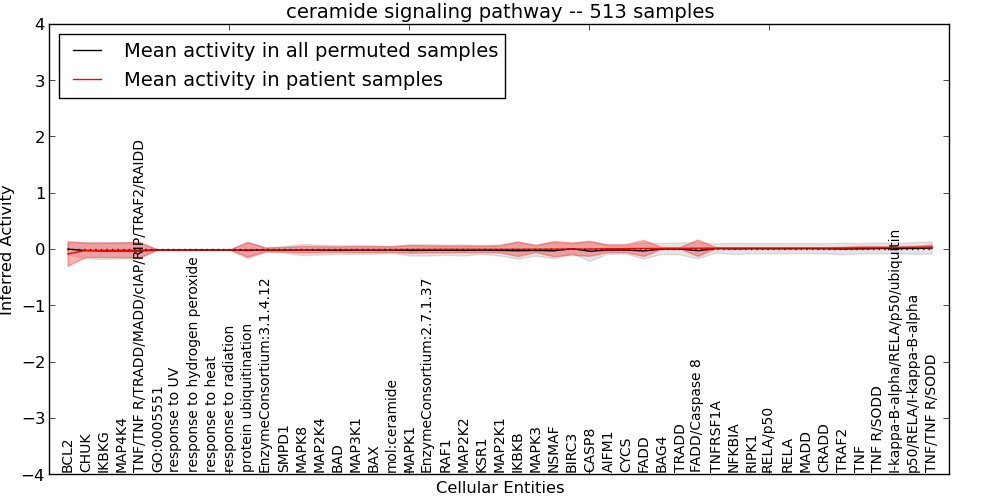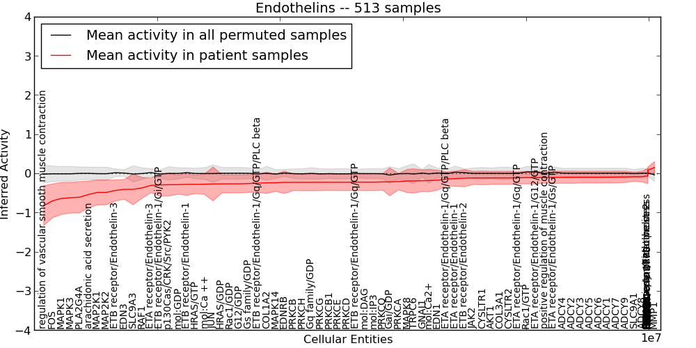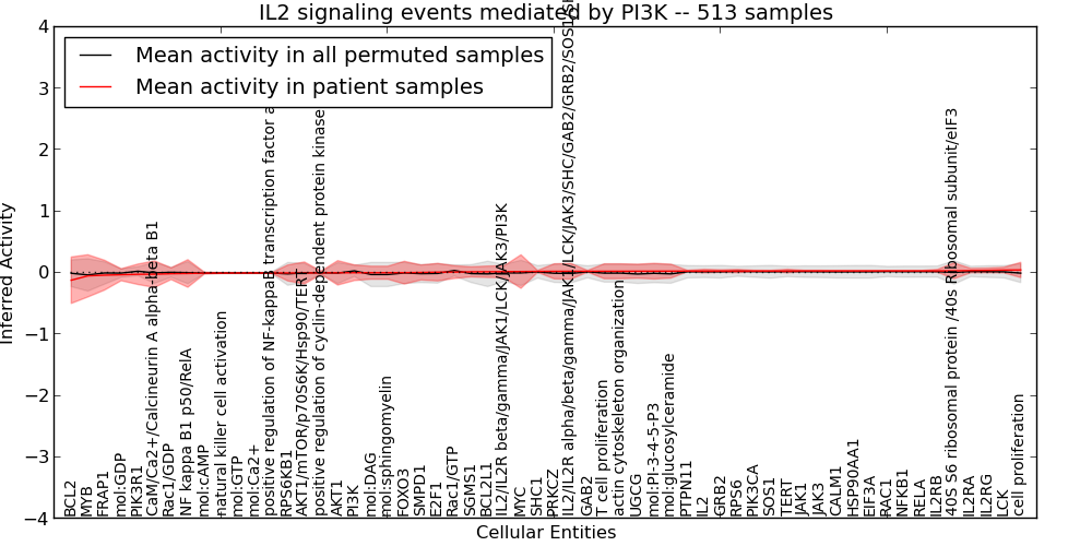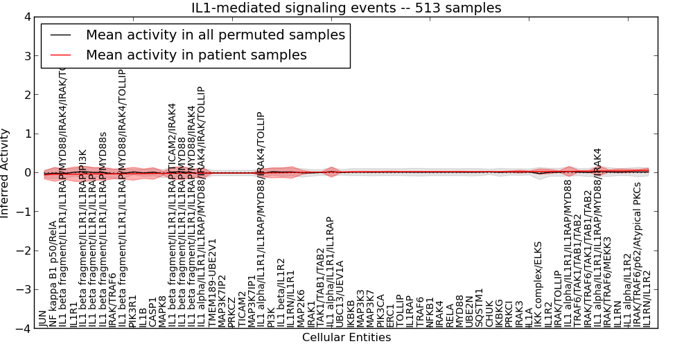 Figure S127. Get High-res Image This plot shows pathway concept perturbations across all samples against a permutation model. The concepts along the x-axis are sorted by lowest to highest mean activity for the real patient samples. Mean inferred activities are plotted along the y-axis as a colored band showing the average level and one standard deviation range. Real samples are shown in red and permuted samples in black.