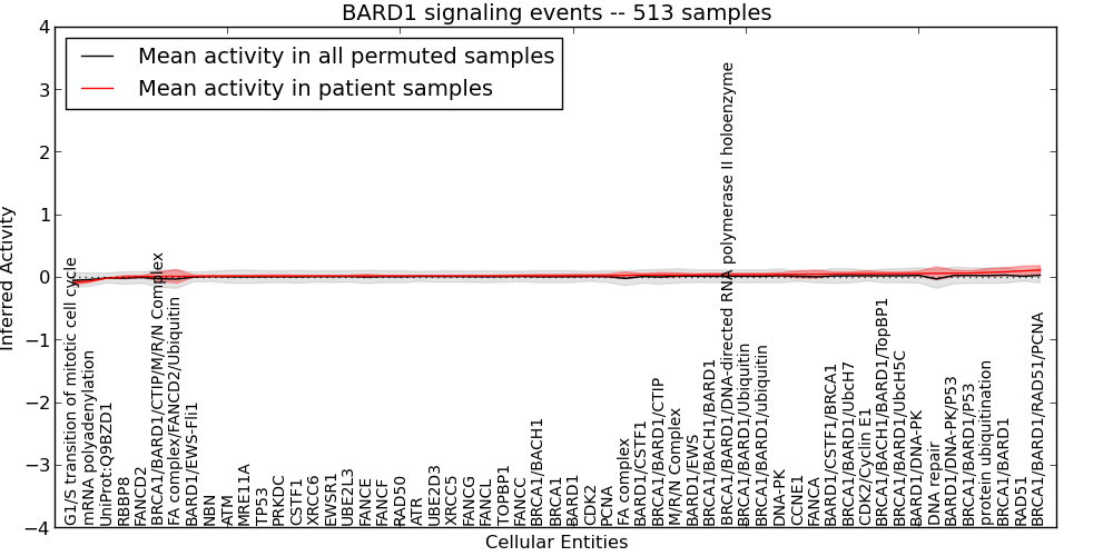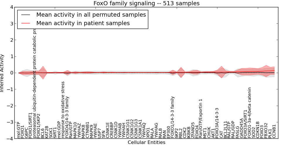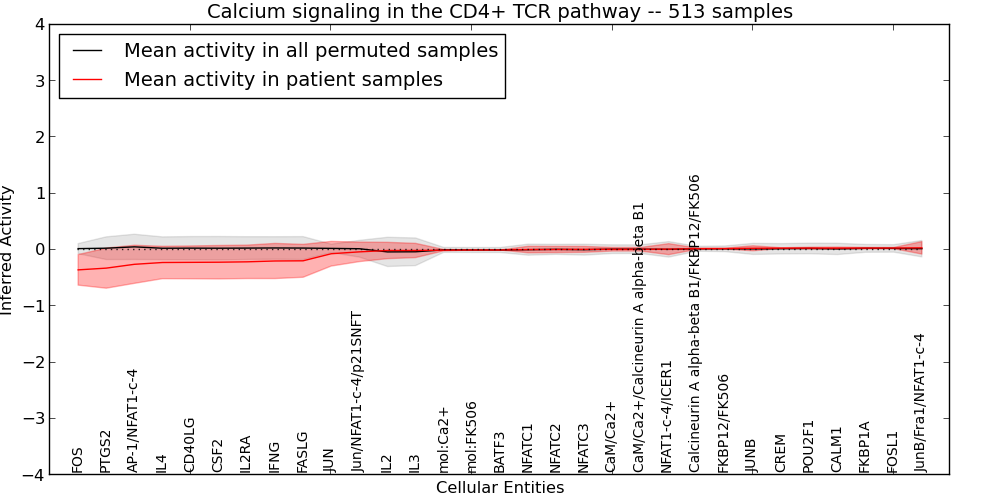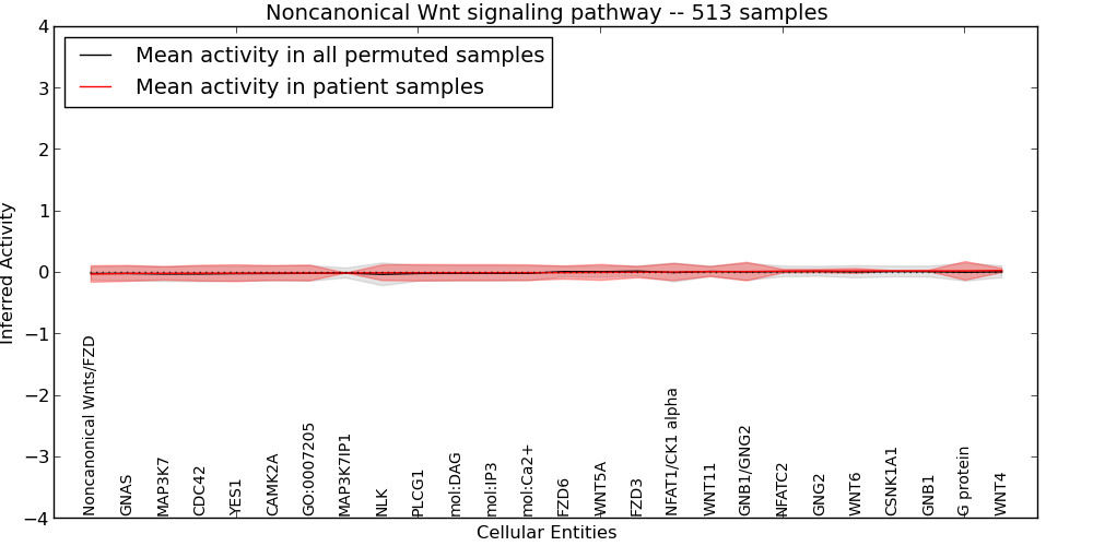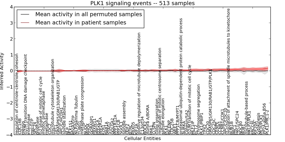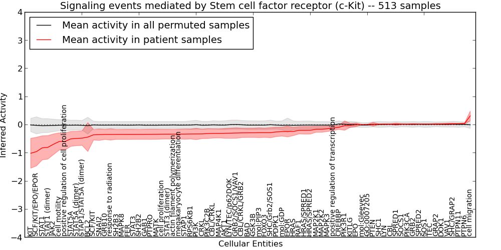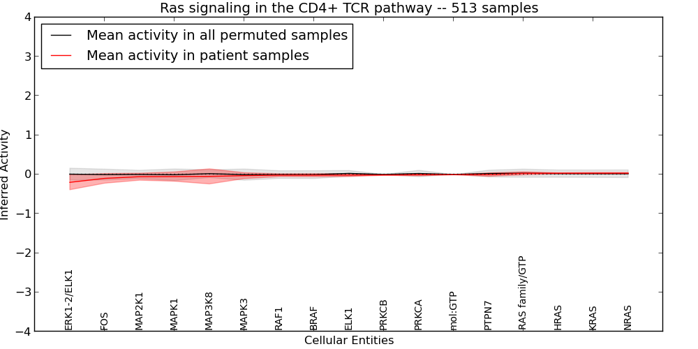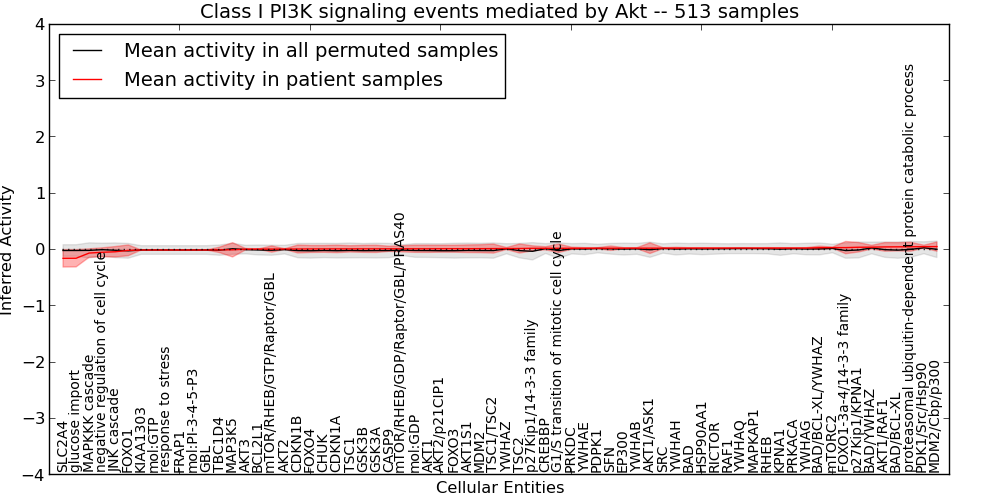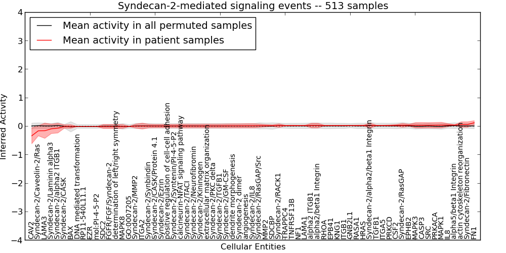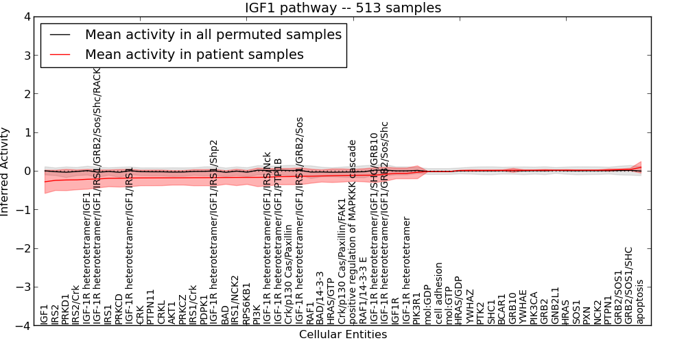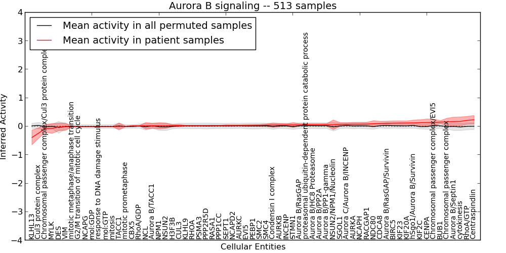 Figure S127. Get High-res Image This plot shows pathway concept perturbations across all samples against a permutation model. The concepts along the x-axis are sorted by lowest to highest mean activity for the real patient samples. Mean inferred activities are plotted along the y-axis as a colored band showing the average level and one standard deviation range. Real samples are shown in red and permuted samples in black.