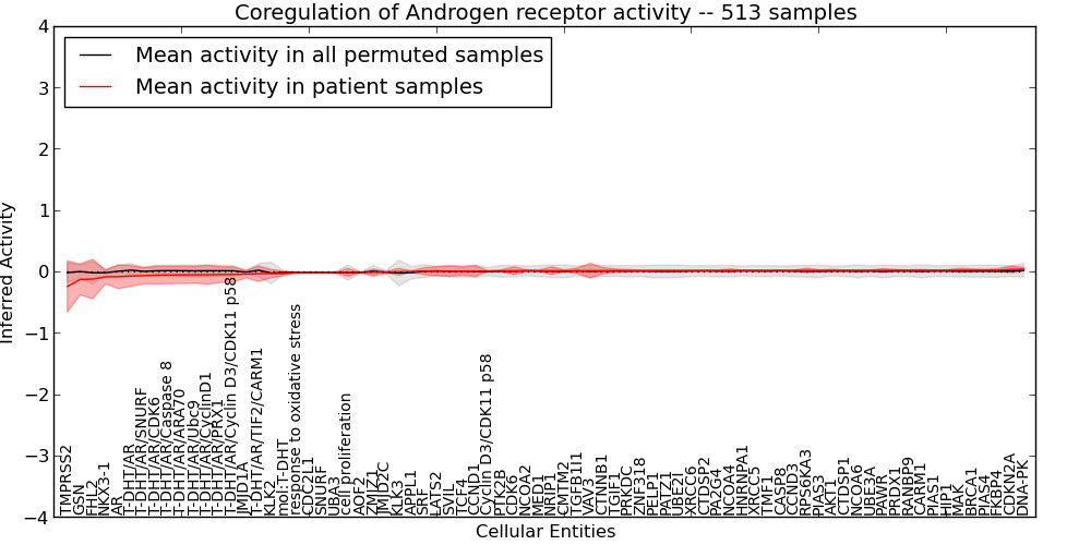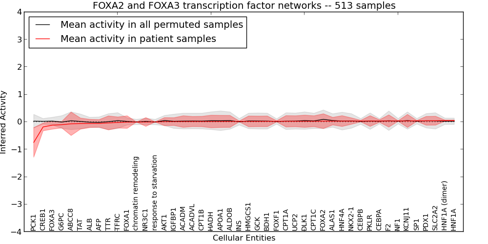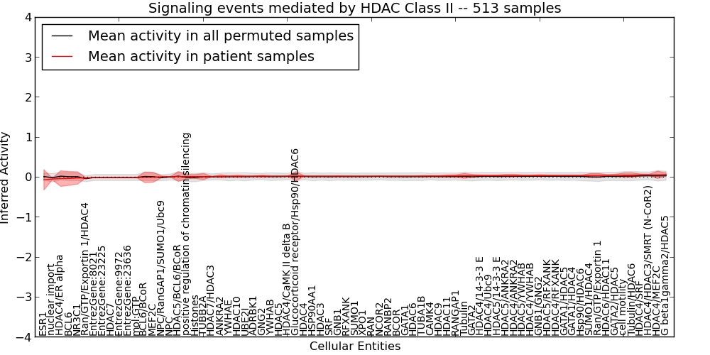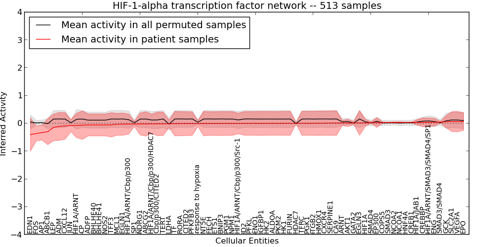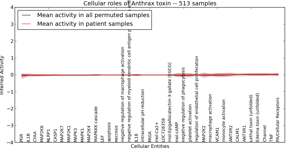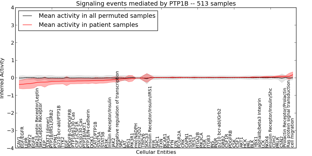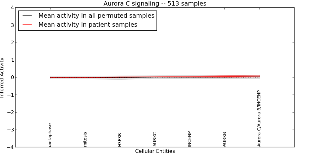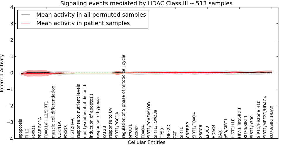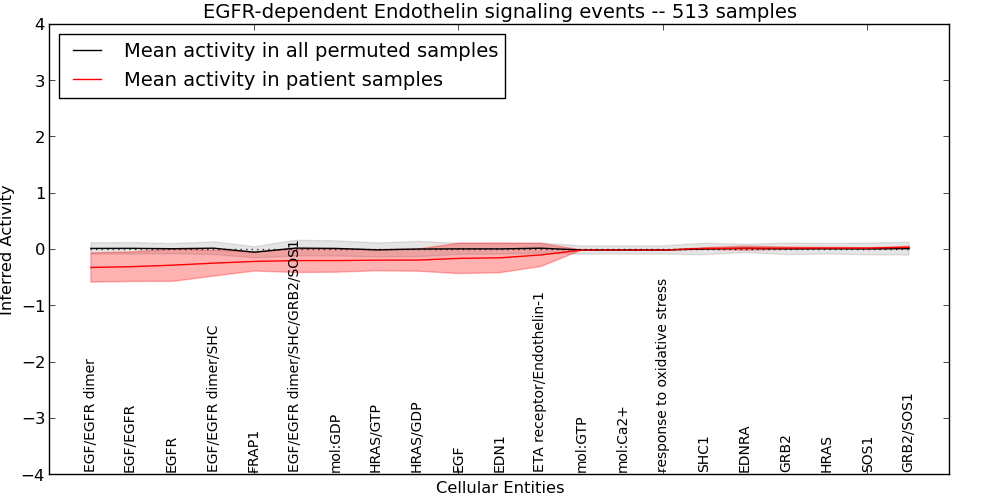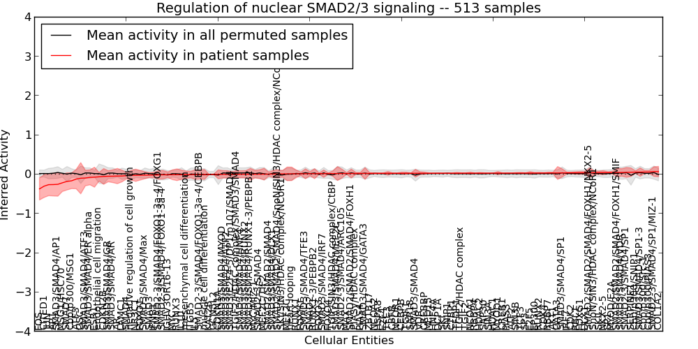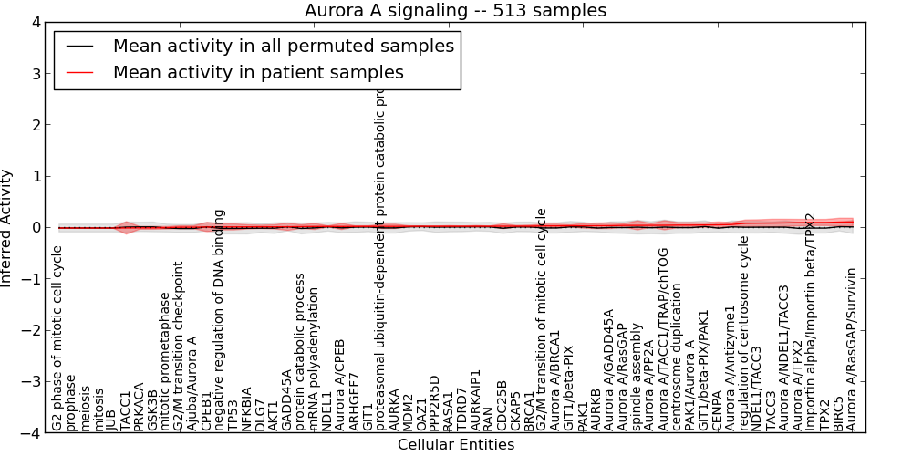 Figure S127. Get High-res Image This plot shows pathway concept perturbations across all samples against a permutation model. The concepts along the x-axis are sorted by lowest to highest mean activity for the real patient samples. Mean inferred activities are plotted along the y-axis as a colored band showing the average level and one standard deviation range. Real samples are shown in red and permuted samples in black.