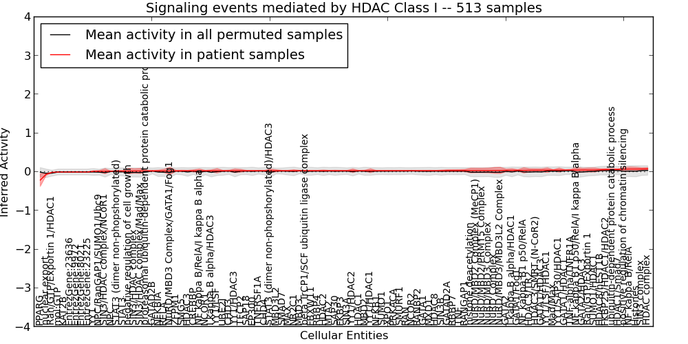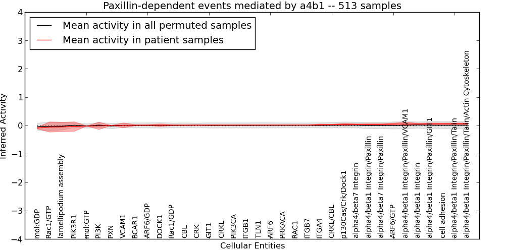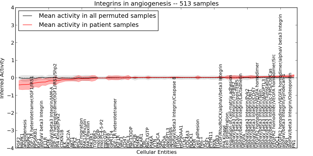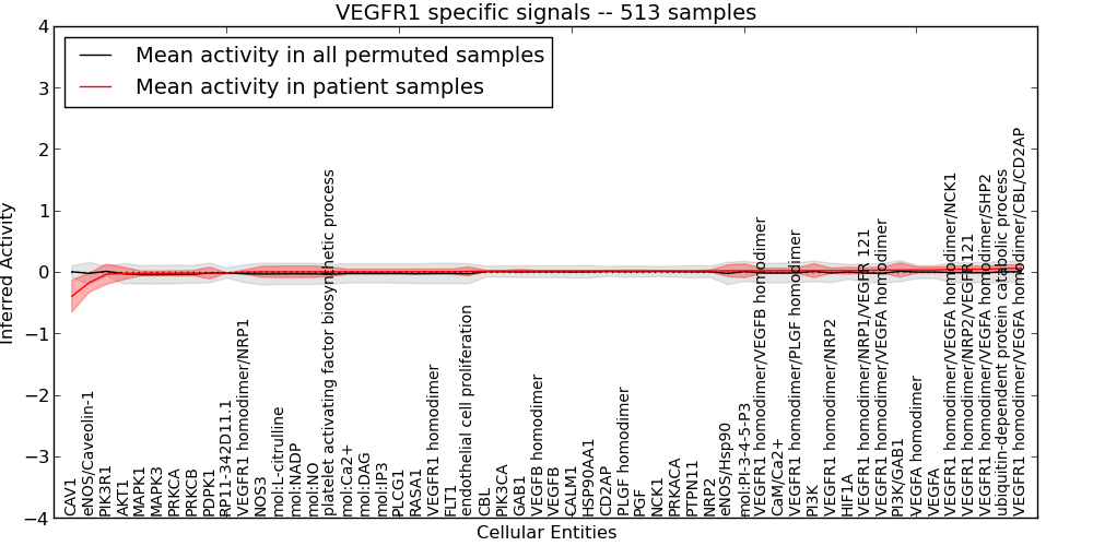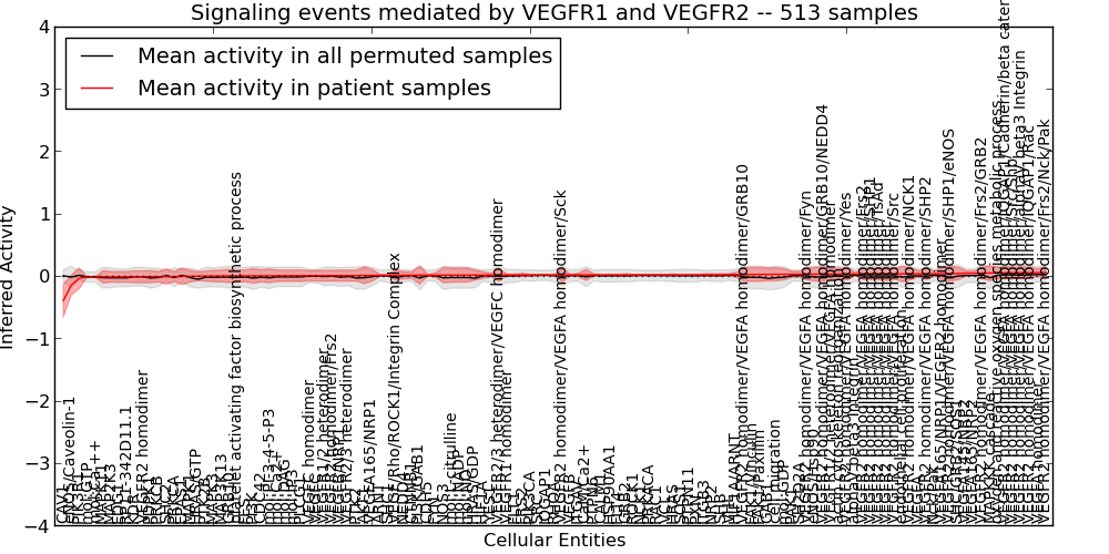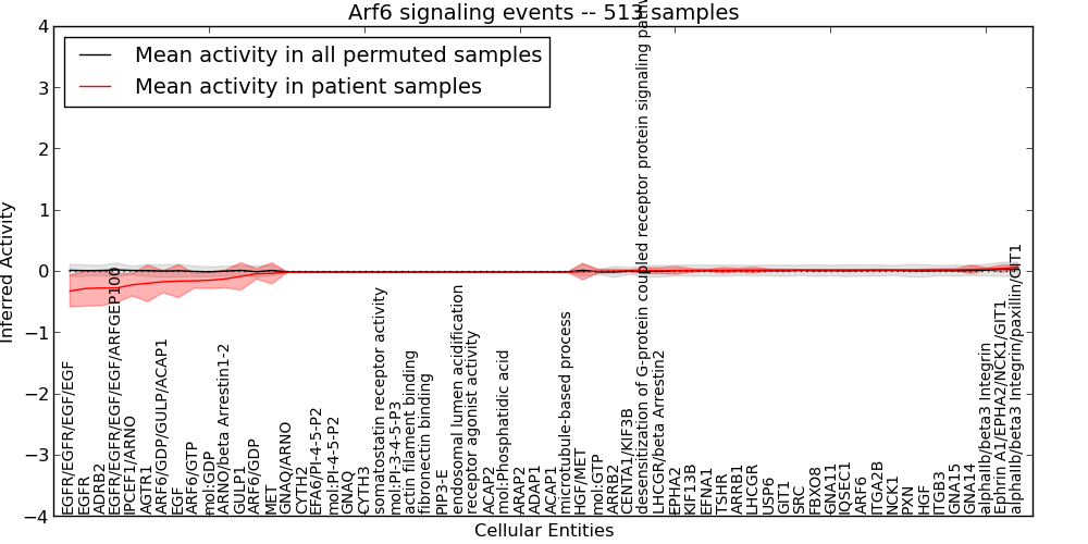Figure S131. Get High-res Image This plot shows pathway concept perturbations across all samples against a permutation model. The concepts along the x-axis are sorted by lowest to highest mean activity for the real patient samples. Mean inferred activities are plotted along the y-axis as a colored band showing the average level and one standard deviation range. Real samples are shown in red and permuted samples in black.