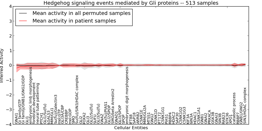 Figure S128. Get High-res Image This plot shows pathway concept perturbations across all samples against a permutation model. The concepts along the x-axis are sorted by lowest to highest mean activity for the real patient samples. Mean inferred activities are plotted along the y-axis as a colored band showing the average level and one standard deviation range. Real samples are shown in red and permuted samples in black.