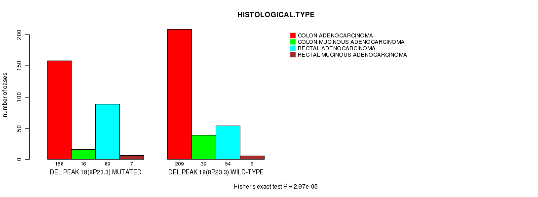 Figure S38. Get High-res Image Gene #65: 'del_18p11.31' versus Clinical Feature #9: 'HISTOLOGICAL.TYPE'