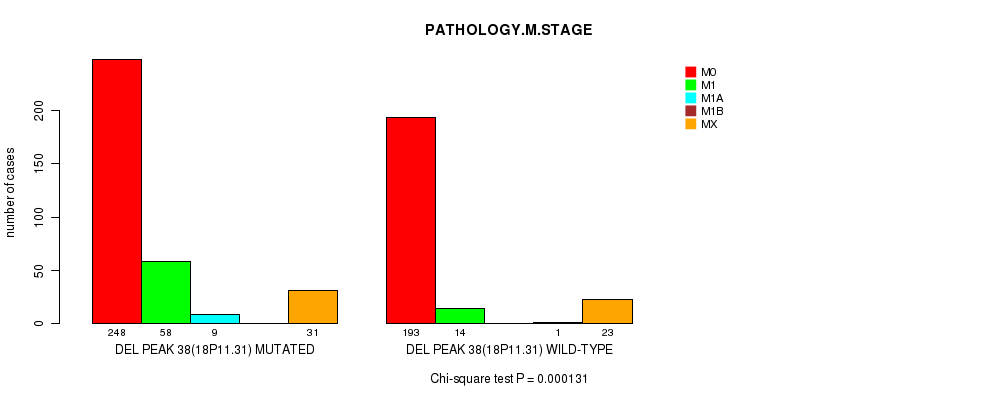 Figure S37. Get High-res Image Gene #65: 'del_18p11.31' versus Clinical Feature #7: 'PATHOLOGY.M.STAGE'