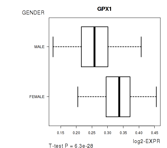 Figure S7. Get High-res Image As an example, this figure shows the association of GPX1 to 'GENDER'. P value = 6.3e-28 with T-test analysis.