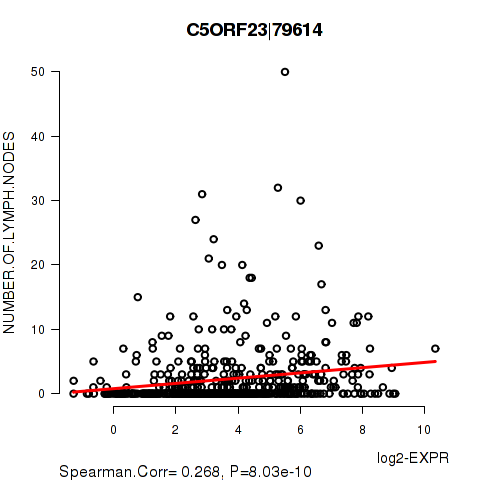 Figure S11. Get High-res Image As an example, this figure shows the association of C5ORF23|79614 to 'NUMBER.OF.LYMPH.NODES'. P value = 8.03e-10 with Spearman correlation analysis. The straight line presents the best linear regression.