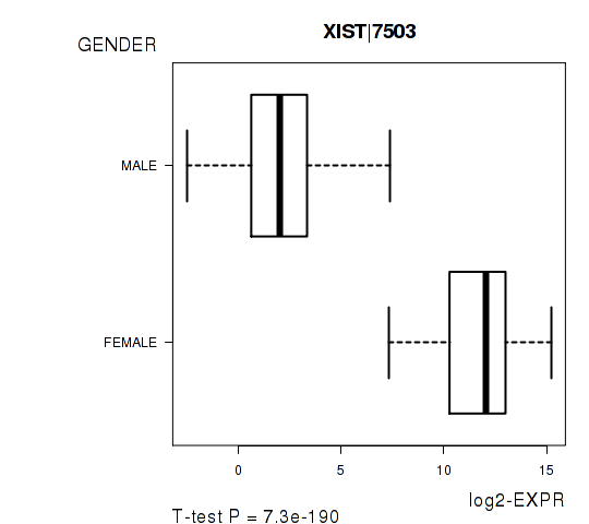 Figure S7. Get High-res Image As an example, this figure shows the association of XIST|7503 to 'GENDER'. P value = 7.3e-190 with T-test analysis.