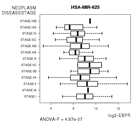 Figure S6. Get High-res Image As an example, this figure shows the association of HSA-LET-7F-2 to 'PATHOLOGY.M.STAGE'. P value = 6.67e-09 with ANOVA analysis.