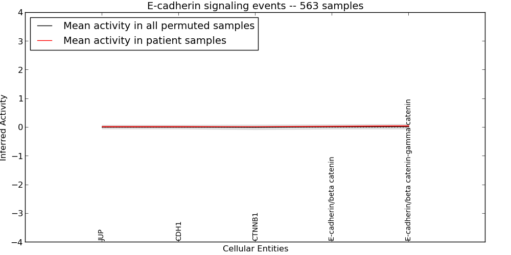 The significance of the IPL obtained for each concept in each patient sample is assessed using a permutation analysis. Importantly, the permutation analysis preserves data tuples so as to preserve any implicit correlations between the different data modalities. For example, genes that are deleted have concomitantly lower expression levels. Preserving the copy number and expression pairs therefore retains this data property. The simulation therefore makes "null samples" by permuting data tuples across all of the genes in the genome so that each gene in a null sample is associated with a random tuple of another gene with equal probability. This approach has the added benefit of preserving the pathway structure so that every observed IPL can be compared to a distribution of random IPLs derived from exactly the same interaction context. PARADIGM inferences are then obtained for 1000 "null" patients and serve as a background distribution to contrast the observed IPLs against. Pathway concepts are excluded from further analysis if they did not obtain a minimum IPL of 0.5 in any patient sample both observed or simulated.